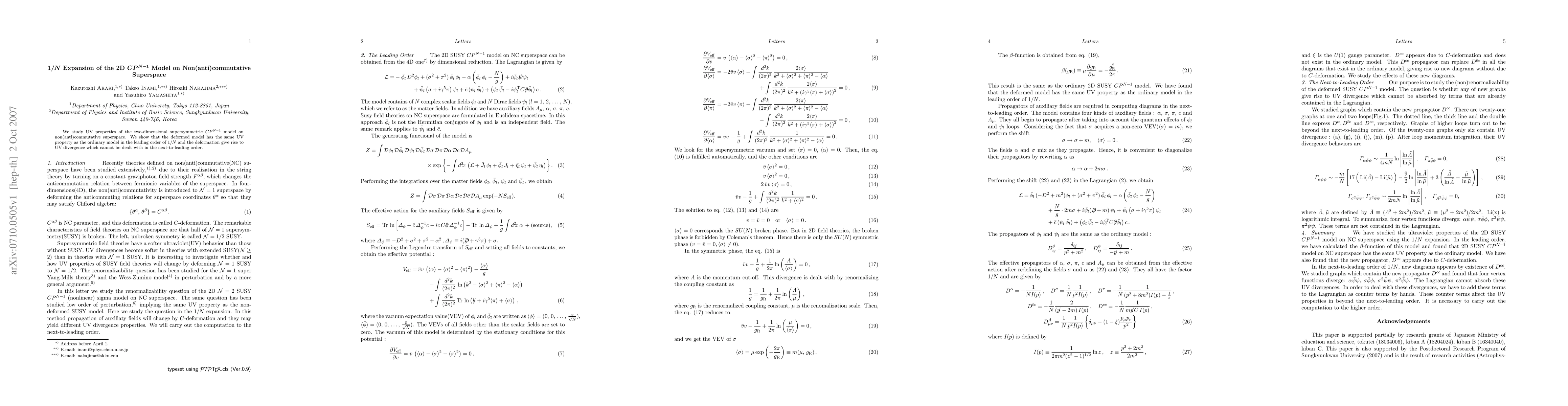 The research examines the ultraviolet properties of the 2D supersymmetric CP^{N-1} model on non(anti)commutative superspace, finding that the leading order 1/N expansion preserves the model's UV behavior, but introduces a divergence not resolvable in the next-to-leading order.