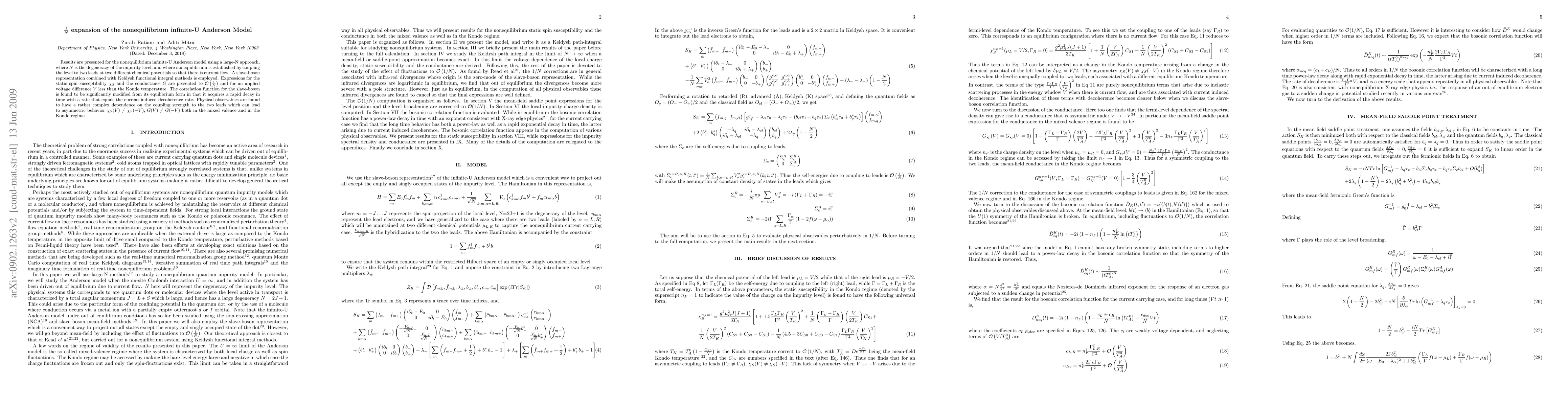 The paper presents a 1/N expansion for the nonequilibrium infinite-U Anderson model, using a large-N approach and slave-boson representation. It derives expressions for the static spin susceptibility and conductance, revealing complex dependencies on coupling strengths to two leads, with asymmetric behaviors observed in both mixed valence and Kondo regimes.