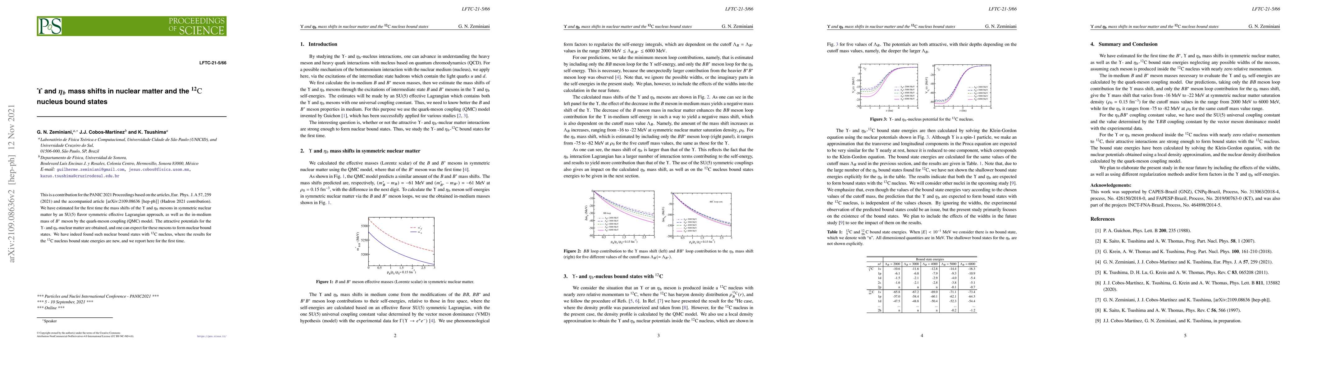 **Summary:** [1] This paper estimates the mass shifts of $\Upsilon$ and $\eta_b$ mesons in nuclear matter and finds new bound state energies for $\Upsilon$ and $\eta_b$ with the $^{12}$C nucleus using an SU(5) effective Lagrangian and QMC model. [2] The study estimates the mass shifts of $\Upsilon$ and $\eta_b$ mesons in nuclear matter and finds bound state energies for $\Upsilon$ and $\eta_b$ with the $^{4}$He nucleus using an effective Lagrangian and QMC model.