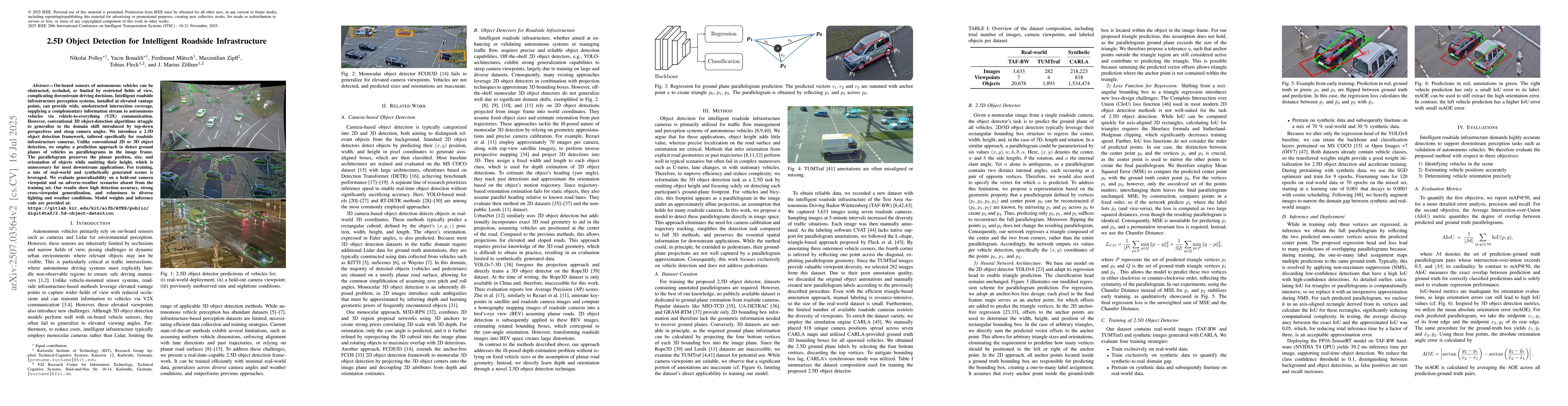 On-board sensors of autonomous vehicles can be obstructed, occluded, or limited by restricted fields of view, complicating downstream driving decisions. Intelligent roadside infrastructure perception systems, installed at elevated vantage points, can provide wide, unobstructed intersection coverage, supplying a complementary information stream to autonomous vehicles via vehicle-to-everything (V2X) communication. However, conventional 3D object-detection algorithms struggle to generalize under the domain shift introduced by top-down perspectives and steep camera angles. We introduce a 2.5D object detection framework, tailored specifically for infrastructure roadside-mounted cameras. Unlike conventional 2D or 3D object detection, we employ a prediction approach to detect ground planes of vehicles as parallelograms in the image frame. The parallelogram preserves the planar position, size, and orientation of objects while omitting their height, which is unnecessary for most downstream applications. For training, a mix of real-world and synthetically generated scenes is leveraged. We evaluate generalizability on a held-out camera viewpoint and in adverse-weather scenarios absent from the training set. Our results show high detection accuracy, strong cross-viewpoint generalization, and robustness to diverse lighting and weather conditions. Model weights and inference code are provided at: https://gitlab.kit.edu/kit/aifb/ATKS/public/digit4taf/2.5d-object-detection