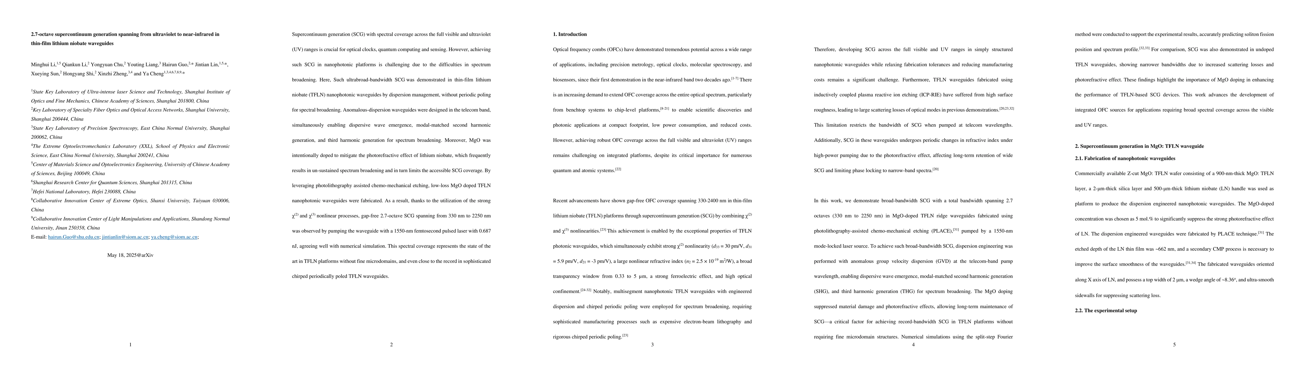 Researchers demonstrated a 2.7-octave supercontinuum spanning from ultraviolet to near-infrared in thin-film lithium niobate waveguides using dispersion management and MgO doping.