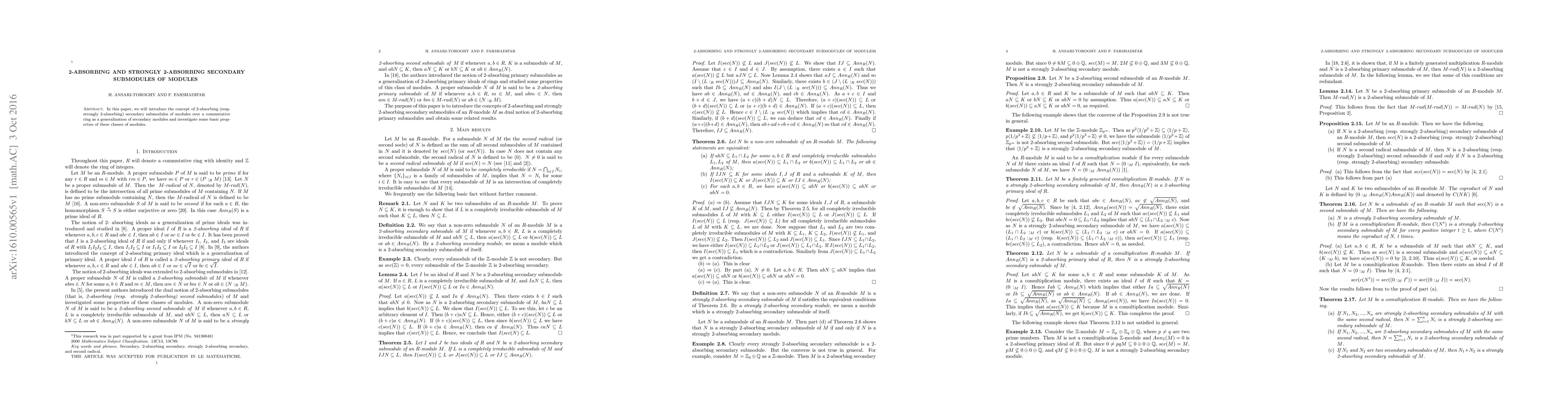Summary: This paper introduces 2-absorbing and strongly 2-absorbing secondary submodules as generalizations of secondary modules over a commutative ring, and explores fundamental properties of these new classes of modules.
