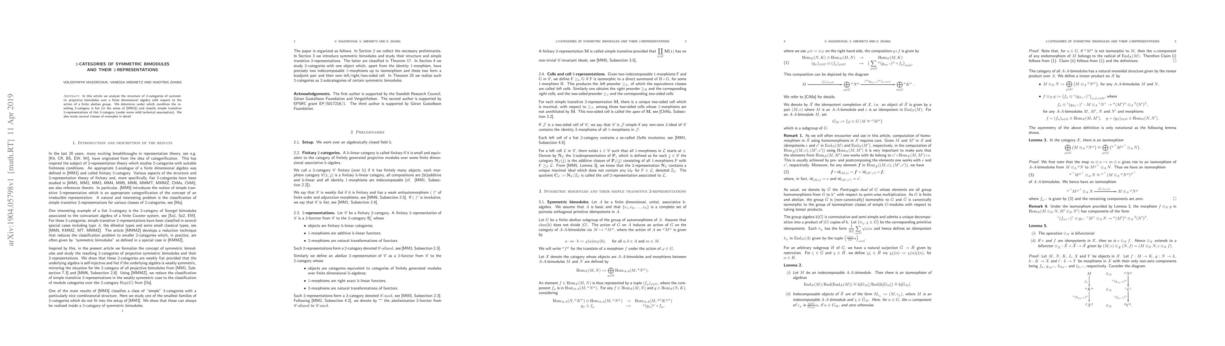 This paper investigates the structure of $2$-categories of symmetric projective bimodules over a finite-dimensional algebra under the action of a finite abelian group, determining conditions for the $2$-category to be fiat and classifying simple transitive $2$-representations. Detailed examples are also provided to illustrate these findings.