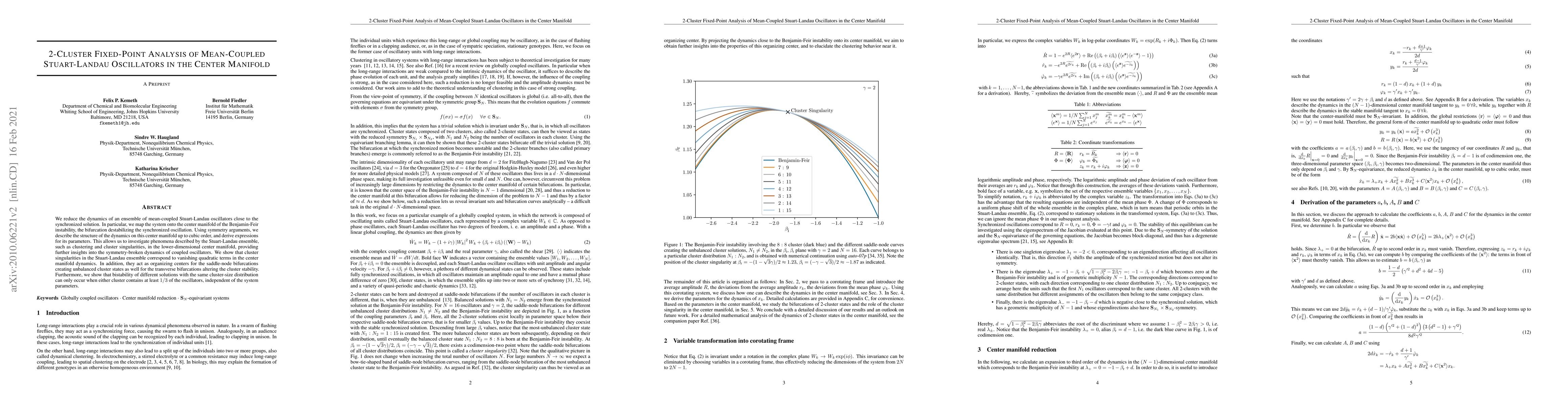 This paper analyzes the dynamics of mean-coupled Stuart-Landau oscillators near synchronization, mapping the system onto the center manifold of the Benjamin-Feir instability. It reveals that cluster singularities act as organizing centers for bifurcations and that bistability of cluster states requires at least one cluster to contain a third of the oscillators.