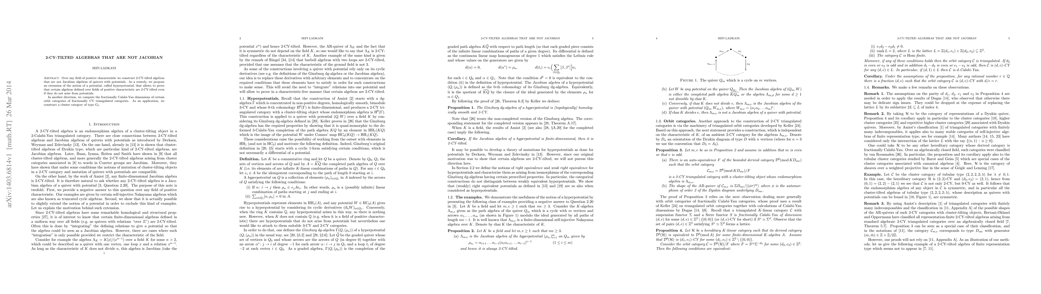 Summary: The paper constructs 2-CY-tilted algebras over fields of positive characteristic that aren't Jacobian algebras, proposing a hyperpotential extension to address this. It also computes fractionally Calabi-Yau dimensions for certain orbit categories, leading to the construction of a cluster category of type $G_2$.