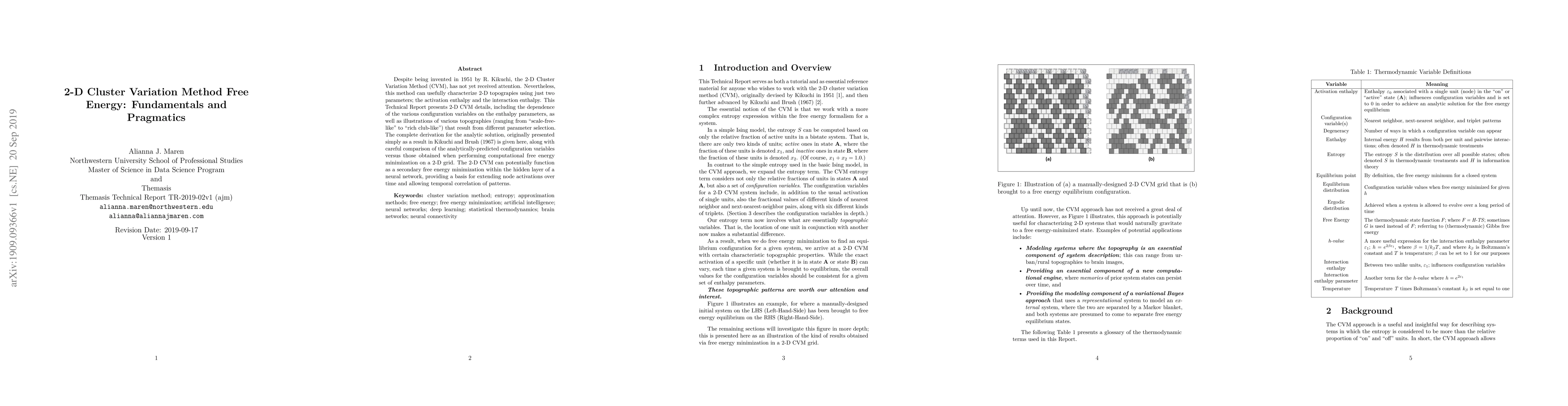 Despite being invented in 1951 by R. Kikuchi, the 2-D Cluster Variation Method (CVM), has not yet received attention. Nevertheless, this method can usefully characterize 2-D topographies using just two parameters; the activation enthalpy and the interaction enthalpy. This Technical Report presents 2-D CVM details, including the dependence of the various configuration variables on the enthalpy parameters, as well as illustrations of various topographies (ranging from scale-free-like to rich club-like) that result from different parameter selection. The complete derivation for the analytic solution, originally presented simply as a result in Kikuchi and Brush (1967) is given here, along with careful comparison of the analytically-predicted configuration variables versus those obtained when performing computational free energy minimization on a 2-D grid. The 2-D CVM can potentially function as a secondary free energy minimization within the hidden layer of a neural network, providing a basis for extending node activations over time and allowing temporal correlation of patterns.
