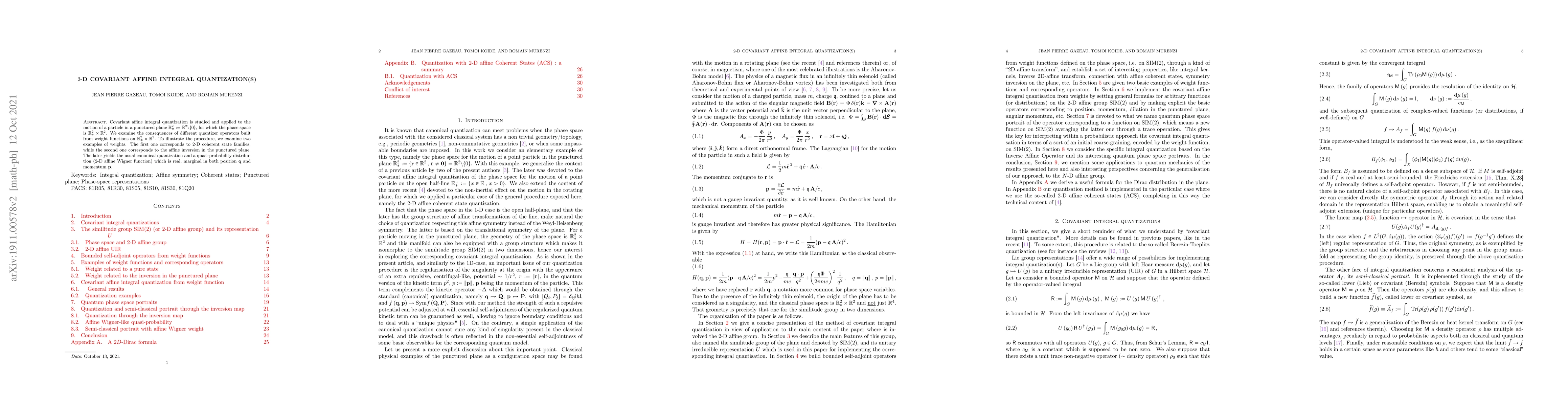 This paper explores covariant affine integral quantization applied to a particle in a punctured plane, examining different quantizer operators based on weight functions. It demonstrates two weight examples: one for 2-D coherent states and another for affine inversion, resulting in canonical quantization and a real, marginal quasi-probability distribution known as the 2-D affine Wigner function.