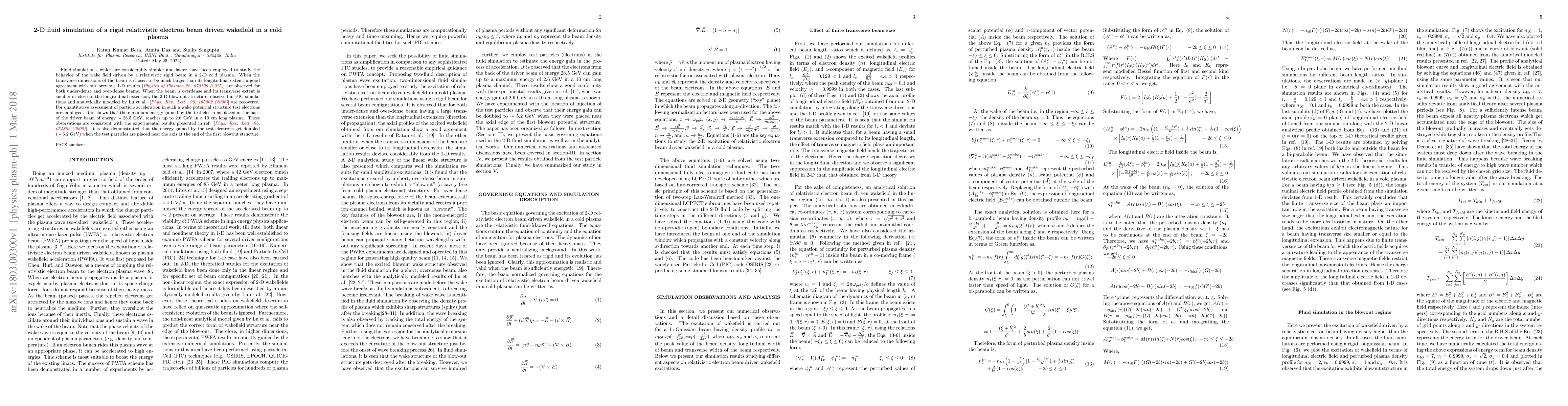 Fluid simulations, which are considerably simpler and faster, have been employed to study the behavior of the wakefield driven by a relativistic rigid beam in a 2-D cold plasma. When the transverse dimensions of the beam are chosen to be much larger than its longitudinal extent, a good agreement with our previous 1-D results [\textcolor{red}{\it Physics of Plasmas 22, 073109 (2015)}] are observed for both under-dense and over-dense beams. When the beam is overdense and its transverse extent is smaller or close to the longitudinal extension, the 2-D blow-out structure, observed in PIC simulations and analytically modeled by Lu et al. [\textcolor{red}{\it Phys. Rev. Lett., 96, 165002 (2006)}] are recovered. For quantitative assessment of particle acceleration in such a wake potential structure test electrons are employed. It is shown that the maximum energy gained by the test electrons placed at the back of the driver beam of energy $\sim 28.5$ GeV, reaches up to $2.6$ GeV in a 10 cm long plasma. These observations are consistent with the experimental results presented in ref. [\textcolor{red}{\it Phys. Rev. Lett. 95, 054802 (2005)}]. It is also demonstrated that the energy gained by the test electrons get doubled ($\sim 5.2$ GeV) when the test particles are placed near the axis at the end of the first blowout structure.