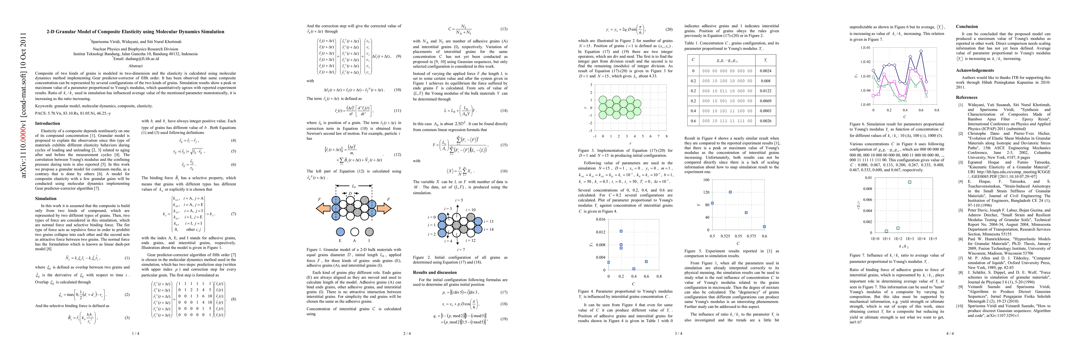 Composite of two kinds of grains is modeled in two-dimension and the elasticity is calculated using molecular dynamics method implementing Gear predictor-corrector of fifth order. It has been observed that same composite concentration can be represented by several configurations of the two kinds of grains. Simulation results show a peak or maximum value of a parameter proportional to Young's modulus, which quantitatively agrees with reported experiment results. Ratio of used in simulation has influenced average value of the mentioned parameter monotonically, it is increasing as the ratio increasing.