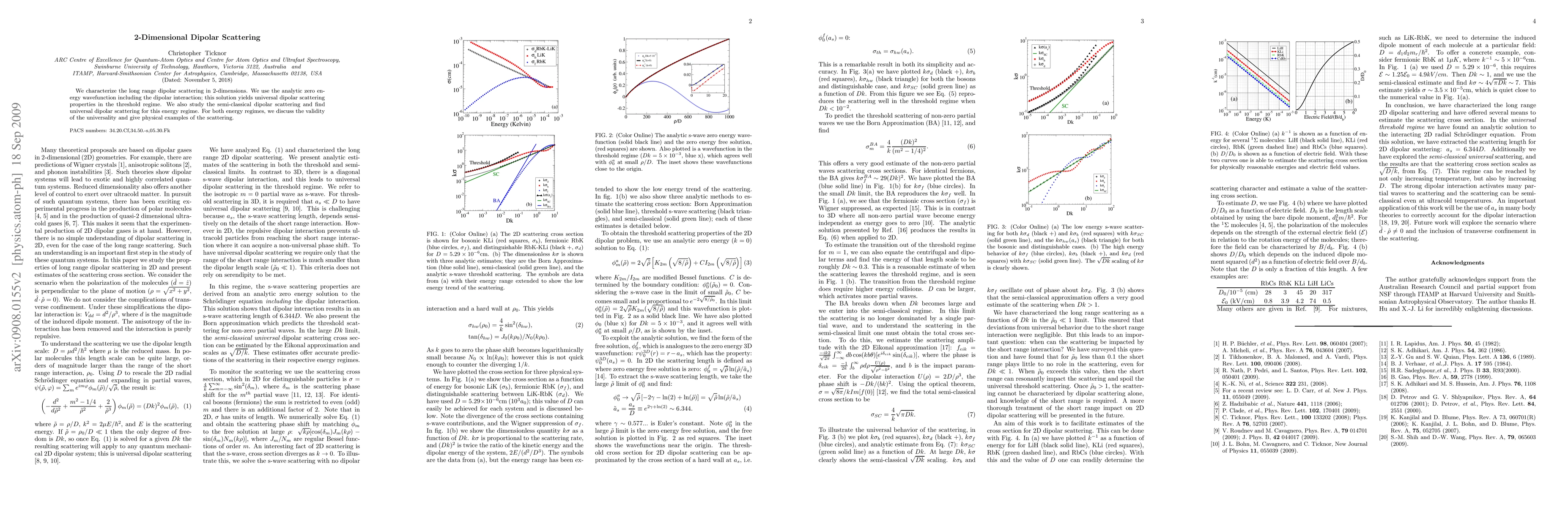 This paper characterizes long-range dipolar scattering in 2D using both analytic and semi-classical approaches, revealing universal scattering properties in both the zero energy and threshold regimes. The study discusses the validity of these universal behaviors and provides physical examples to illustrate the findings.