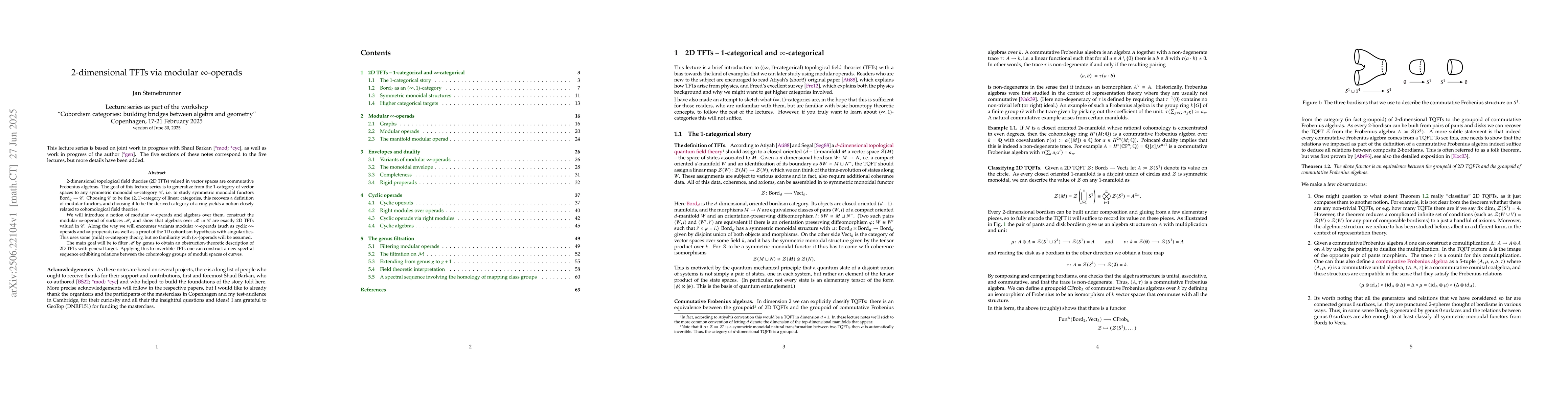 This lecture series is based on joint work in progress with Shaul Barkan, as well as work in progress of the author. The five sections of these notes correspond to the five lectures, but more details have been added. $2$-dimensional topological field theories ($2$D TFTs) valued in vector spaces are commutative Frobenius algebras. The goal of this lecture series is to generalize from the $1$-category of vector spaces to any symmetric monoidal $\infty$-category $\mathcal{C}$, i.e. to study symmetric monoidal functors $\mathrm{Bord}_2 \to \mathcal{C}$. Choosing $\mathcal{C}$ to be the $(2,1)$-category of linear categories, this recovers a definition of modular functors, and choosing it to be the derived category of a ring yields a notion closely related to cohomological field theories. We will introduce a notion of modular $\infty$-operads and algebras over them, construct the modular $\infty$-operad of surfaces $\mathcal{M}$, and show that algebras over $\mathcal{M}$ in $\mathcal{C}$ are exactly $2$D TFTs valued in $\mathcal{C}$. Along the way we will encounter variants modular $\infty$-operads (such as cyclic $\infty$-operads and $\infty$-properads) as well as a proof of the $1$D cobordism hypothesis with singularities. This uses some (mild) $\infty$-category theory, but no familiarity with ($\infty$-)operads will be assumed. The main goal will be to filter $\mathcal{M}$ by genus to obtain an obstruction-theoretic description of $2$D TFTs with general target. Applying this to invertible TFTs one can construct a new spectral sequence exhibiting relations between the cohomology groups of moduli spaces of curves.