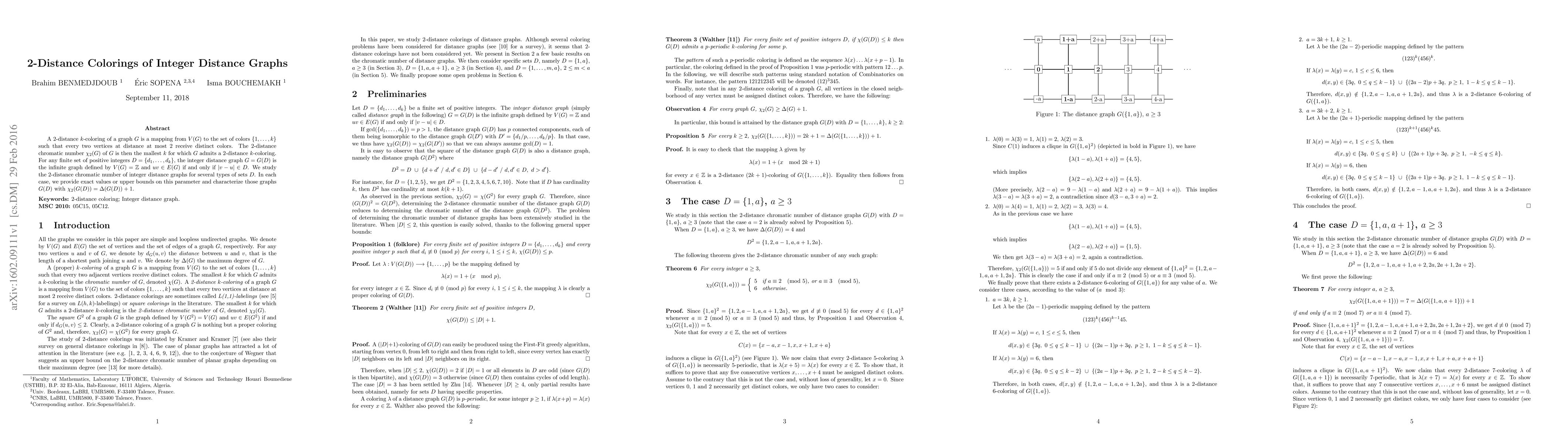 A 2-distance k-coloring of a graph G is a mapping from V (G) to the set of colors {1,. .. , k} such that every two vertices at distance at most 2 receive distinct colors. The 2-distance chromatic number $\chi$ 2 (G) of G is then the mallest k for which G admits a 2-distance k-coloring. For any finite set of positive integers D = {d 1 ,. .. , d k }, the integer distance graph G = G(D) is the infinite graph defined by V (G) = Z and uv $\in$ E(G) if and only if |v -- u| $\in$ D. We study the 2-distance chromatic number of integer distance graphs for several types of sets D. In each case, we provide exact values or upper bounds on this parameter and characterize those graphs G(D) with $\chi$ 2 (G(D)) = {\Delta}(G(D)) + 1.