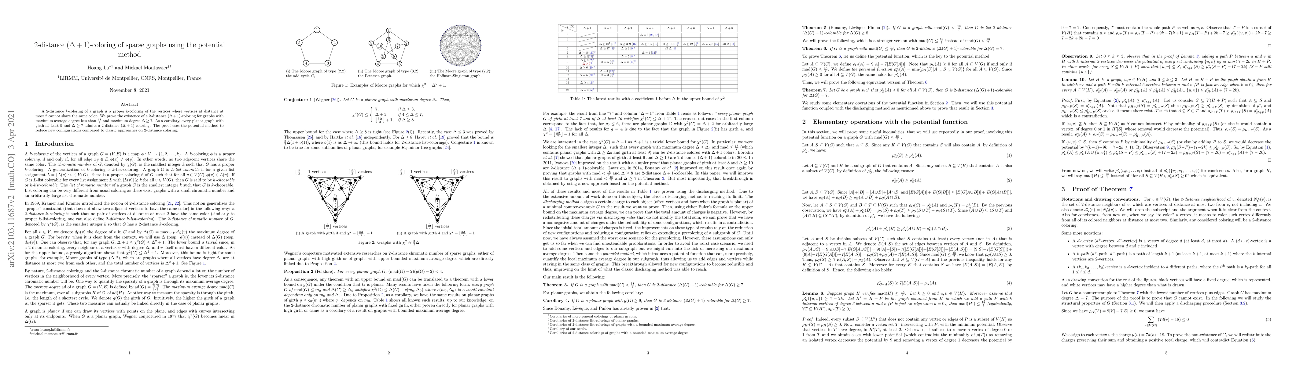 Summary: This paper proves the existence of a $2$-distance $(\Delta+1)$-coloring for sparse graphs with a maximum average degree less than $\frac{18}{7}$ and maximum degree $\Delta\geq 7$. The proof leverages the potential method to handle new configurations, leading to a corollary that every planar graph with girth at least $9$ and $\Delta\geq 7$ admits such a coloring.