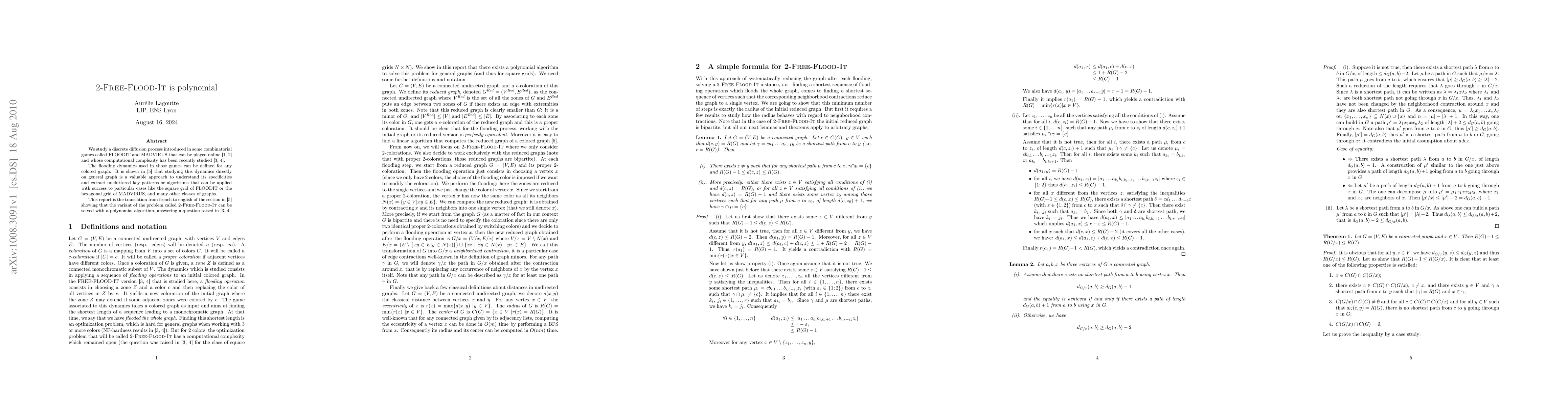 We study a discrete diffusion process introduced in some combinatorial games called FLOODIT and MADVIRUS that can be played online and whose computational complexity has been recently studied by Arthur et al (FUN'2010). The flooding dynamics used in those games can be defined for any colored graph. It has been shown in a first report (in french, hal-00509488 on HAL archive) that studying this dynamics directly on general graph is a valuable approach to understand its specificities and extract uncluttered key patterns or algorithms that can be applied with success to particular cases like the square grid of FLOODIT or the hexagonal grid of MADVIRUS, and many other classes of graphs. This report is the translation from french to english of the section in the french report showing that the variant of the problem called 2-FREE-FLOOD-IT can be solved with a polynomial algorithm, answering a question raised in the previous study of FLOODIT by Arthur et al.