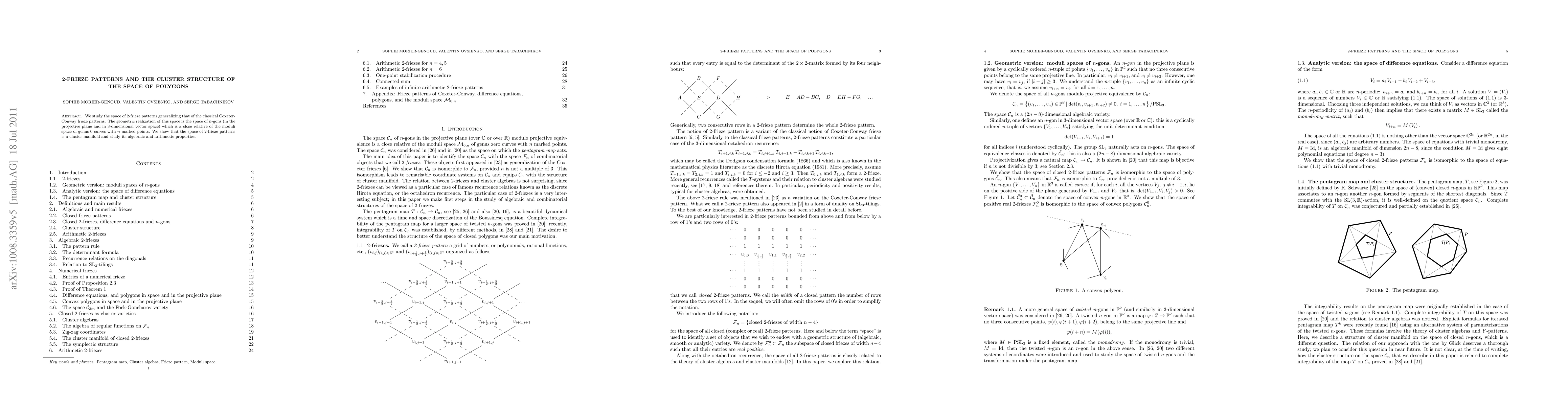 We study the space of 2-frieze patterns generalizing that of the classical Coxeter-Conway frieze patterns. The geometric realization of this space is the space of n-gons (in the projective plane and in 3-dimensional vector space) which is a close relative of the moduli space of genus 0 curves with n marked points. We show that the space of 2-frieze patterns is a cluster manifold and study its algebraic and arithmetic properties.