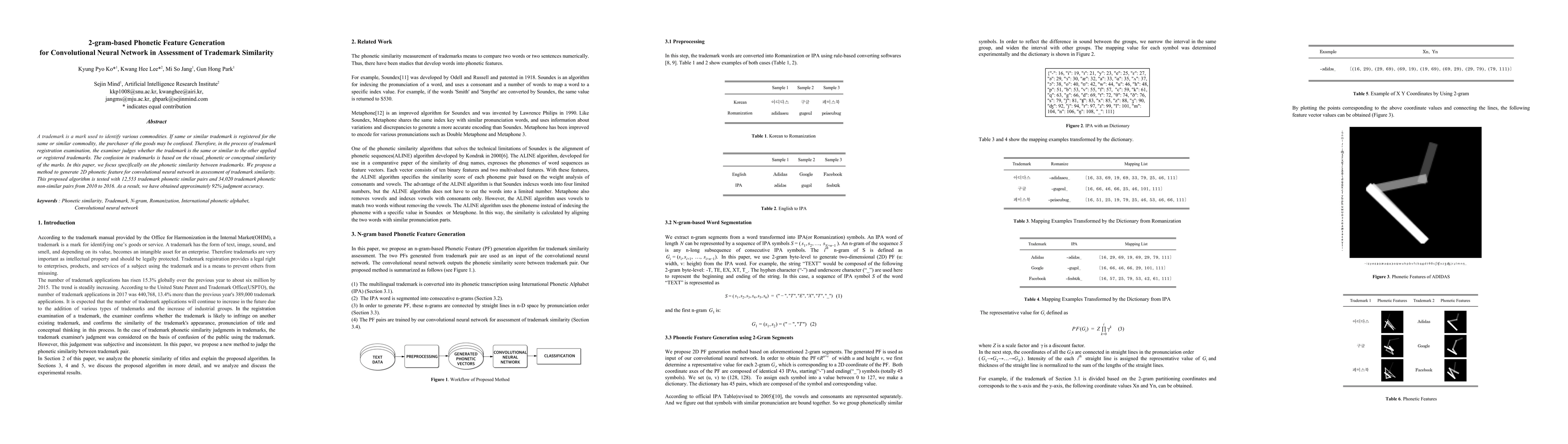 This paper proposes a method for generating 2-gram-based phonetic features to assess trademark similarity using convolutional neural networks. The algorithm achieved approximately 92% accuracy in distinguishing phonetic similar and non-similar trademark pairs.