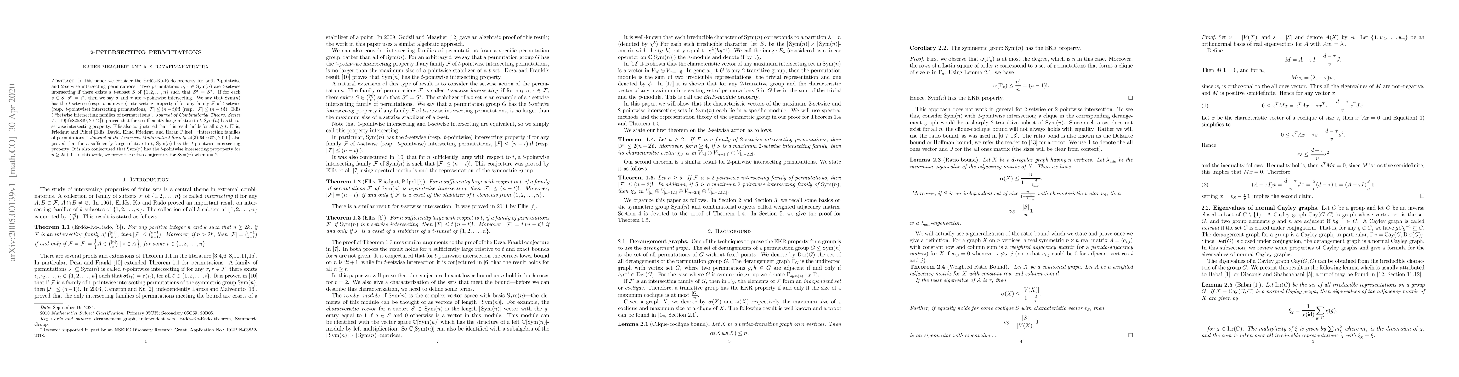 In this paper we consider the Erd\H{o}s-Ko-Rado property for both $2$-pointwise and $2$-setwise intersecting permutations. Two permutations $\sigma,\tau \in Sym(n)$ are $t$-setwise intersecting if there exists a $t$-subset $S$ of $\{1,2,\dots,n\}$ such that $S^\sigma = S^\tau$. If for each $s\in S$, $s^\sigma = s^\tau$, then we say $\sigma$ and $\tau$ are $t$-pointwise intersecting. We say that $Sym(n)$ has the $t$-setwise (resp. $t$-pointwise) intersecting property if for any family $\mathcal{F}$ of $t$-setwise (resp. $t$-pointwise) intersecting permutations, $|\mathcal{F}| \leq (n-t)!t!$ (resp. $|\mathcal{F}| \leq (n-t)!$). Ellis (["Setwise intersecting families of permutation". { Journal of Combinatorial Theory, Series A}, 119(4):825-849, 2012.]), proved that for $n$ sufficiently large relative to $t$, $Sym(n)$ has the $t$-setwise intersecting property. Ellis also conjuctured that this result holds for all $n \geq t$. Ellis, Friedgut and Pilpel [Ellis, David, Ehud Friedgut, and Haran Pilpel. "Intersecting families of permutations." {Journal of the American Mathematical Society} 24(3):649-682, 2011.] also proved that for $n$ sufficiently large relative to $t$, $Sym(n)$ has the $t$-pointwise intersecting property. It is also conjectured that $Sym(n)$ has the $t$-pointwise intersecting propoperty for $n\geq 2t+1$. In this work, we prove these two conjectures for $Sym(n)$ when $t=2$.