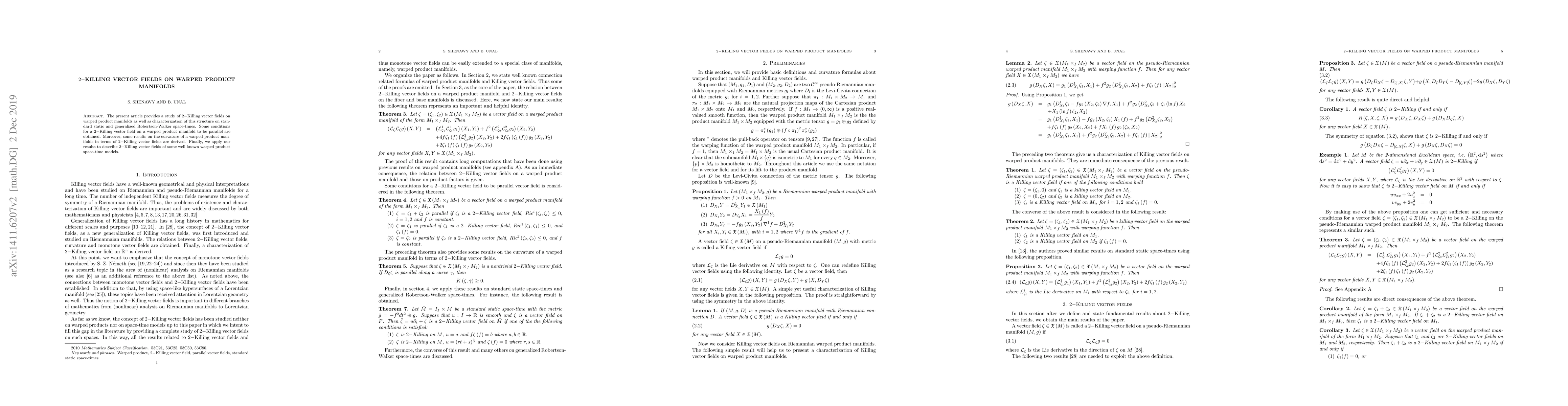 This paper investigates $2-$Killing vector fields on warped product manifolds, providing conditions for their parallelism and relating them to curvature. It also characterizes these fields in standard static and generalized Robertson-Walker space-times and applies the findings to well-known warped product space-time models.