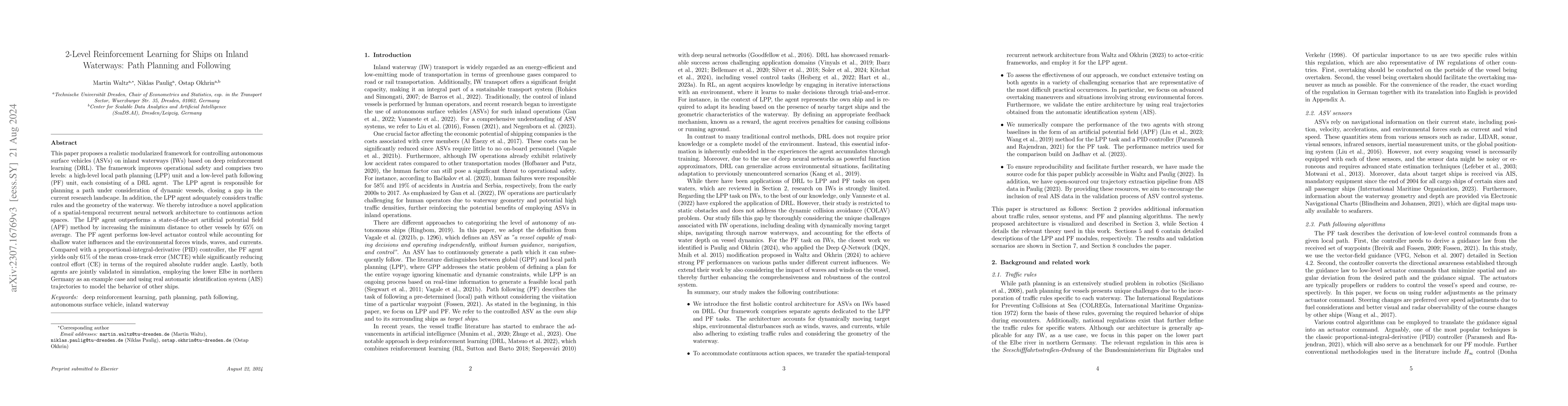 This paper introduces a two-level reinforcement learning framework for controlling autonomous surface vehicles on inland waterways, featuring a high-level local path planning agent and a low-level path following agent, both utilizing deep reinforcement learning. The framework enhances operational safety and control efficiency compared to traditional methods.