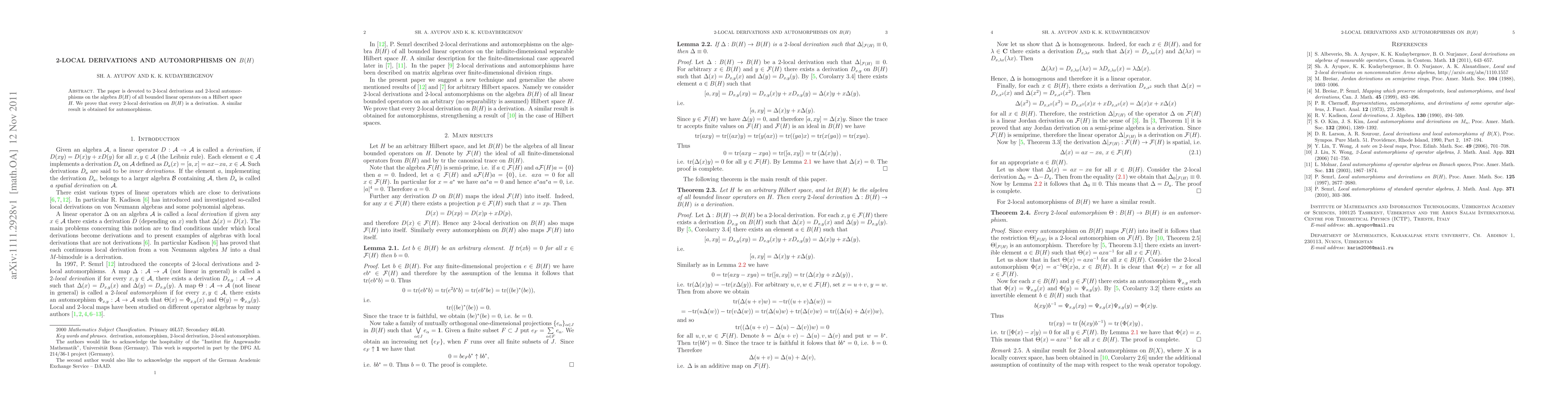 The paper shows that every 2-local derivation on $B(H)$ is a derivation, and a similar result holds for automorphisms.