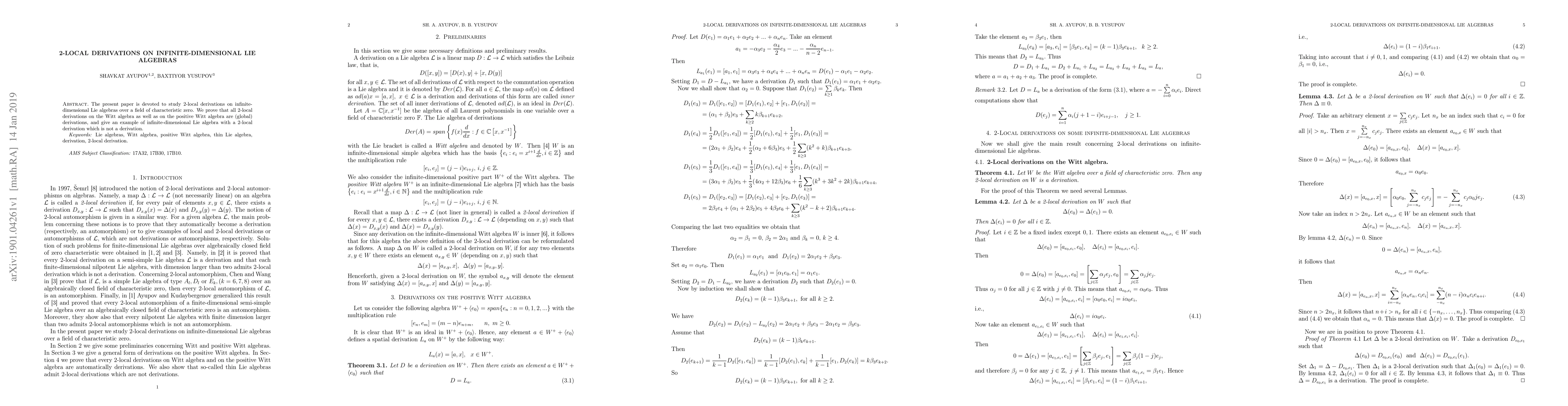 This paper investigates 2-local derivations on infinite-dimensional Lie algebras, proving that such derivations on the Witt and positive Witt algebras are global derivations, while also presenting an example of an infinite-dimensional Lie algebra with a 2-local derivation that is not a derivation.