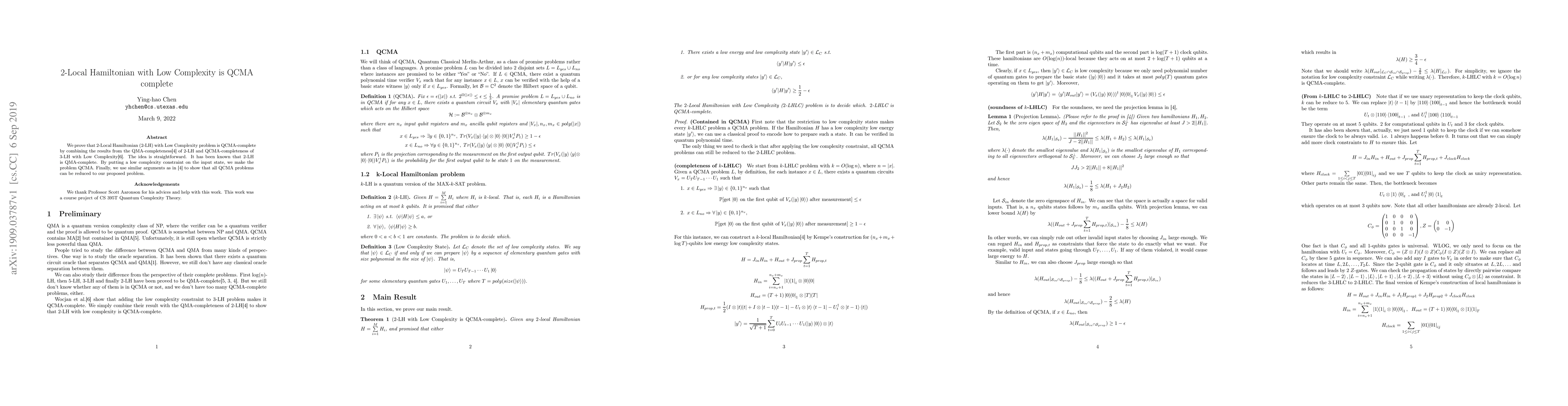 This paper proves that the 2-Local Hamiltonian problem with a low complexity constraint is QCMA-complete by leveraging the known QMA-completeness of 2-LH and the QCMA-completeness of 3-LH with low complexity. The authors demonstrate that all QCMA problems can be reduced to this proposed problem.