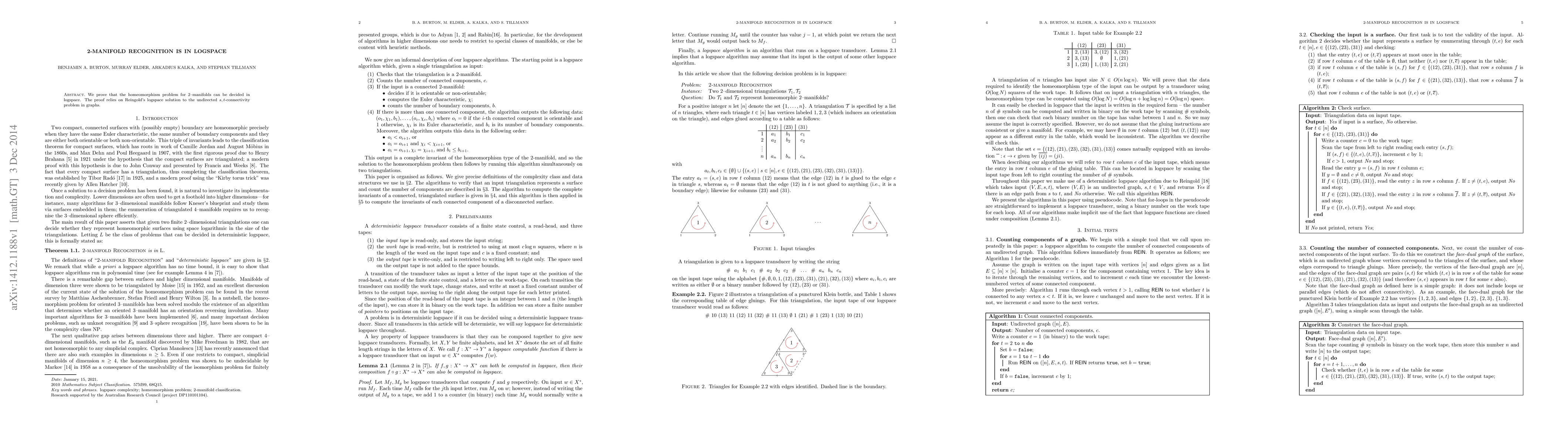 Summary: This paper demonstrates that the homeomorphism problem for 2-manifolds can be solved in logarithmic space, leveraging Reingold's logspace algorithm for undirected graph connectivity. This result significantly advances the understanding of computational complexity in topological problems.