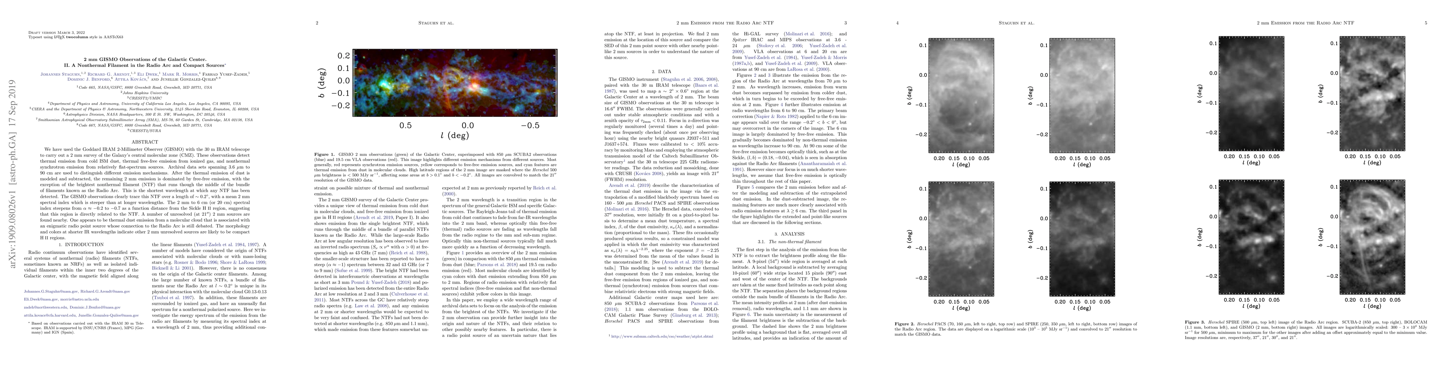 We have used the Goddard IRAM 2-Millimeter Observer (GISMO) with the 30 m IRAM telescope to carry out a 2 mm survey of the Galaxy's central molecular zone (CMZ). These observations detect thermal emission from cold ISM dust, thermal free-free emission from ionized gas, and nonthermal synchrotron emission from relatively flat-spectrum sources. Archival data sets spanning $3.6 \mu$m to 90 cm are used to distinguish different emission mechanisms. After the thermal emission of dust is modeled and subtracted, the remaining 2 mm emission is dominated by free-free emission, with the exception of the brightest nonthermal filament (NTF) that runs though the middle of the bundle of filaments known as the Radio Arc. This is the shortest wavelength at which any NTF has been detected. The GISMO observations clearly trace this NTF over a length of ~0.2$^\circ$, with a mean 2 mm spectral index which is steeper than at longer wavelengths. The 2 mm to 6 cm (or 20 cm) spectral index steepens from $\alpha \approx -0.2$ to $-0.7$ as a function distance from the Sickle H II region, suggesting that this region is directly related to the NTF. A number of unresolved (at $21''$) 2 mm sources are found nearby. One appears to be thermal dust emission from a molecular cloud that is associated with an enigmatic radio point source whose connection to the Radio Arc is still debated. The morphology and colors at shorter IR wavelengths indicate other 2 mm unresolved sources are likely to be compact H II regions.
