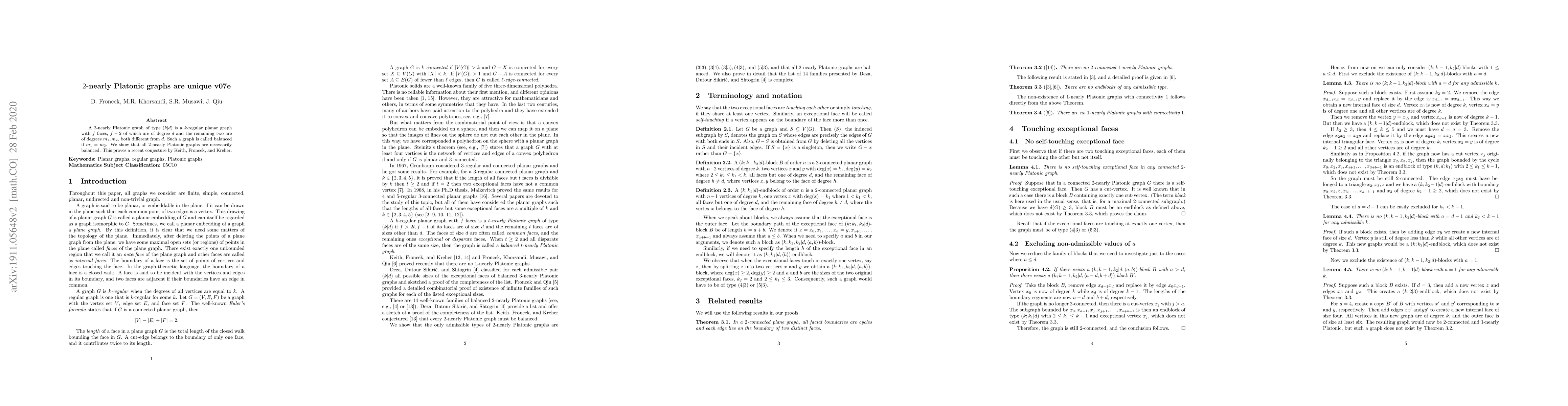 The paper presents detailed proofs and classifications of 2-nearly Platonic graphs, demonstrating their balanced nature and unique structures for touching and non-touching exceptional faces.