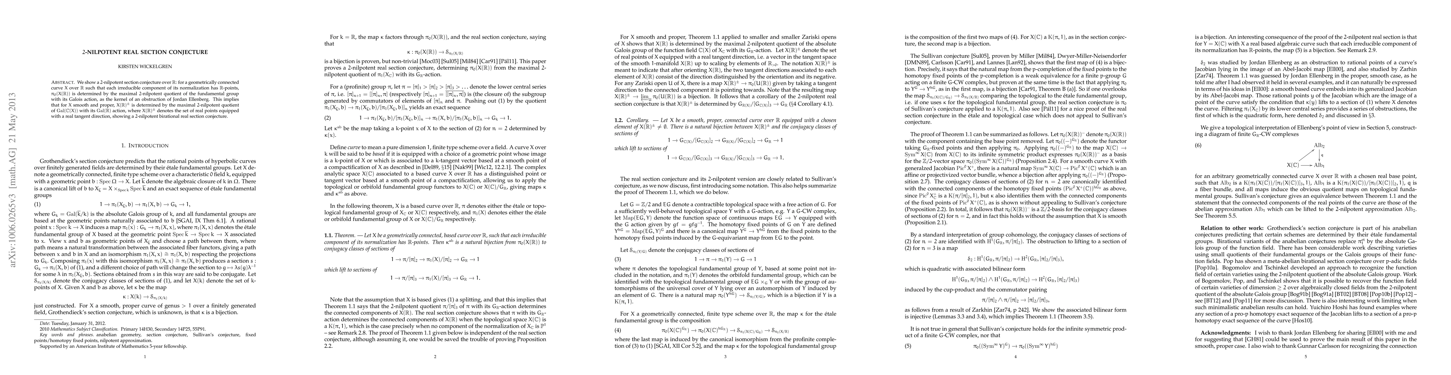 The paper proves the 2-nilpotent section conjecture for geometrically connected curves over R, showing that the 0th homotopy group of real points is determined by the maximal 2-nilpotent quotient of the fundamental group with Galois action. This result also implies a 2-nilpotent birational real section conjecture for smooth and proper curves.