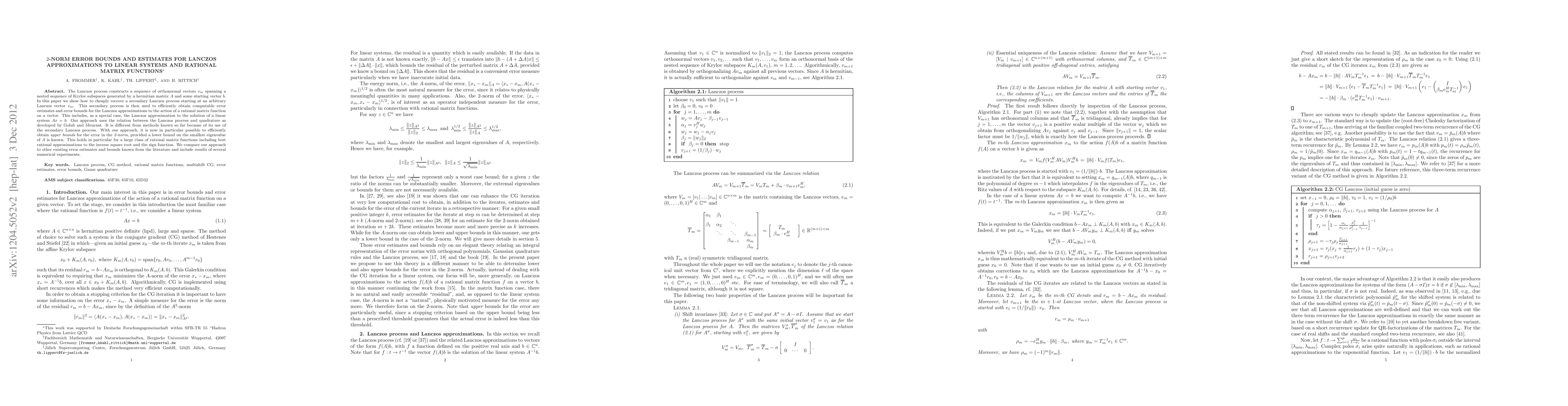 This paper presents a method to efficiently obtain 2-norm error bounds for Lanczos approximations to linear systems and rational matrix functions, using a secondary Lanczos process. It provides upper bounds for the error when a lower bound on the smallest eigenvalue of the matrix is known, and compares its approach with existing methods.