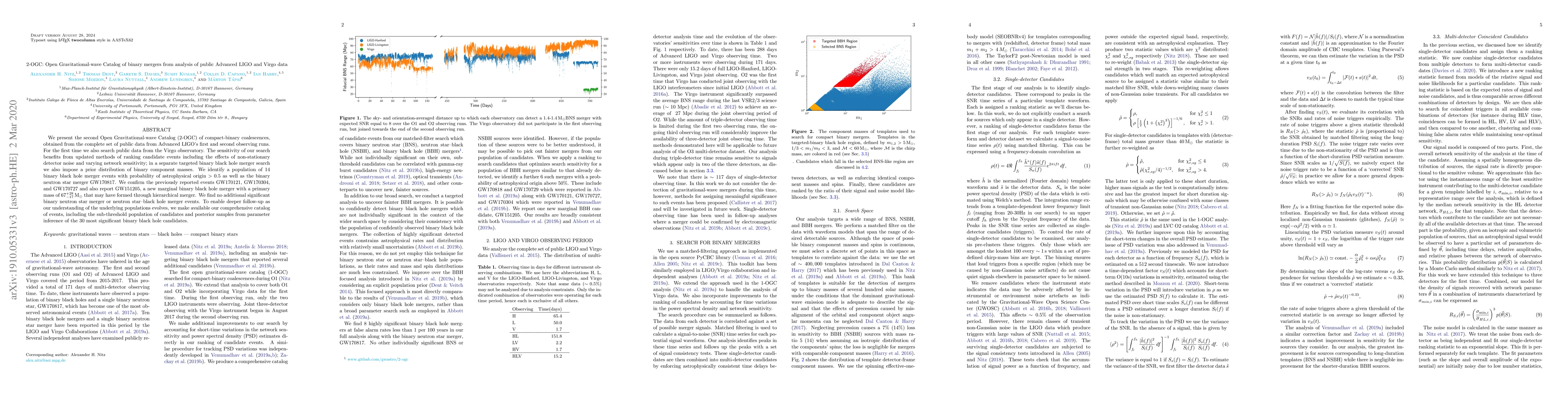 We present the second Open Gravitational-wave Catalog (2-OGC) of compact-binary coalescences, obtained from the complete set of public data from Advanced LIGO's first and second observing runs. For the first time we also search public data from the Virgo observatory. The sensitivity of our search benefits from updated methods of ranking candidate events including the effects of non-stationary detector noise and varying network sensitivity; in a separate targeted binary black hole merger search we also impose a prior distribution of binary component masses. We identify a population of 14 binary black hole merger events with probability of astrophysical origin $> 0.5$ as well as the binary neutron star merger GW170817. We confirm the previously reported events GW170121, GW170304, and GW170727 and also report GW151205, a new marginal binary black hole merger with a primary mass of $67^{+28}_{-17}\,\mathrm{M}_{\odot}$ that may have formed through hierarchical merger. We find no additional significant binary neutron star merger or neutron star--black hole merger events. To enable deeper follow-up as our understanding of the underlying populations evolves, we make available our comprehensive catalog of events, including the sub-threshold population of candidates and posterior samples from parameter inference of the 30 most significant binary black hole candidates.