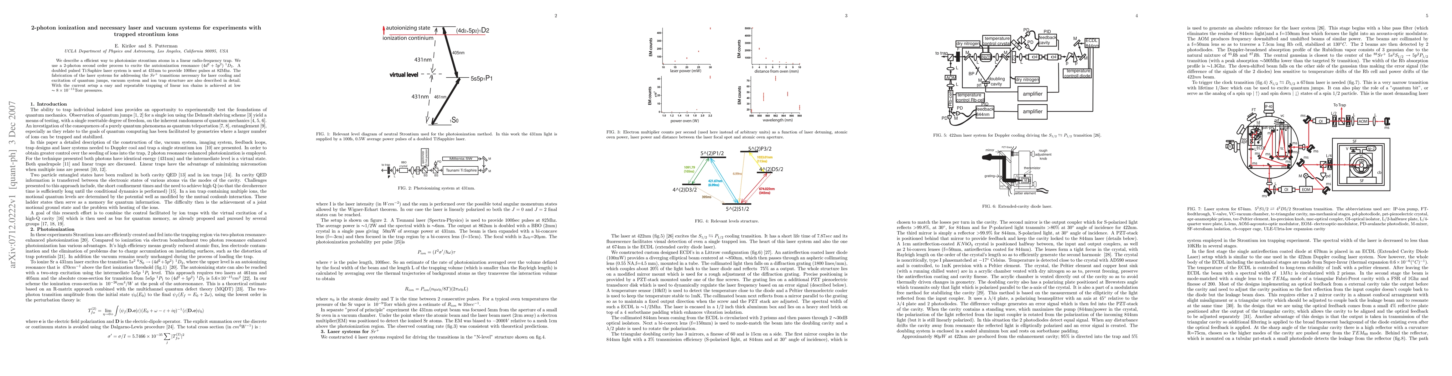 We describe a efficient way to photoionize strontium atoms in a linear radio-frequency trap. We use a 2-photon second order process to excite the autoionization resonance (4d2 + 5p2) 1D2. A doubled pulsed Ti:Saphire laser system is used at 431nm to provide 100fsec pulses at 82Mhz. The fabrication of the laser systems for addressing the Sr+ transitions necessary for laser cooling and excitation of quantum jumps, vacuum system and ion trap structure are also described in detail. With the current setup a easy and repeatable trapping of linear ion chains is achieved at UHV pressures.