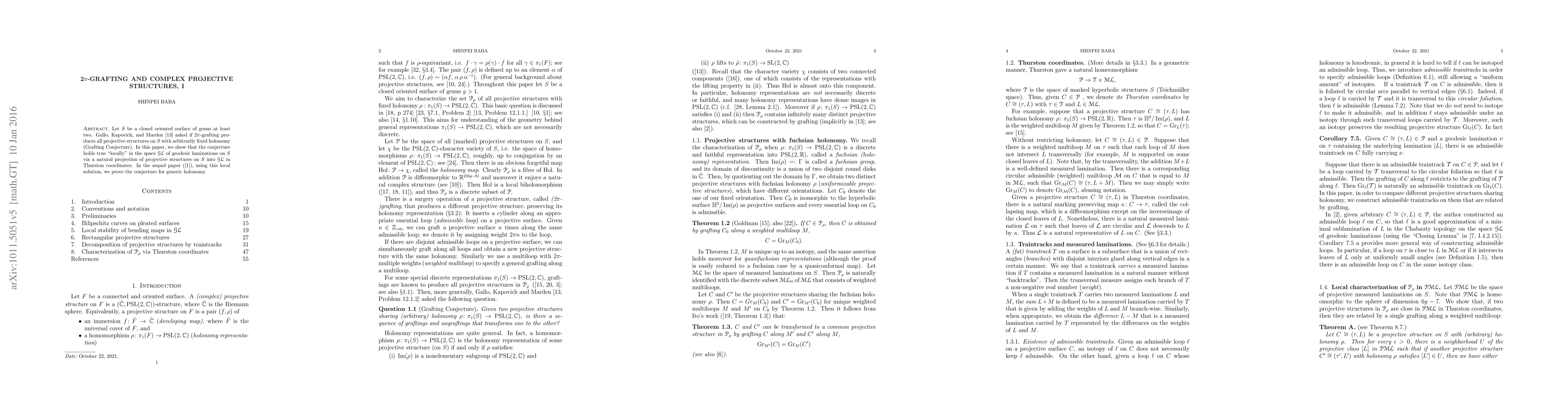 This paper demonstrates that the Grafting Conjecture holds true locally in the space of geodesic laminations on a closed oriented surface of genus at least two, using a natural projection of projective structures in Thurston coordinates. The authors plan to extend this local solution to prove the conjecture for generic holonomy in a subsequent paper.