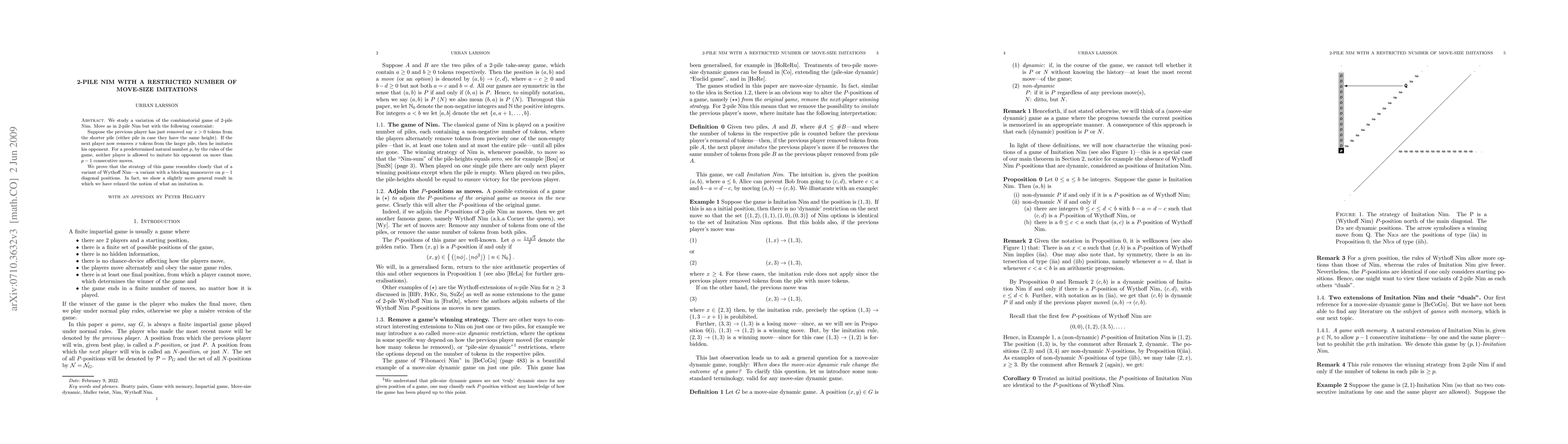 We study a variation of the combinatorial game of 2-pile Nim. Move as in 2-pile Nim but with the following constraint: Suppose the previous player has just removed say $x>0$ tokens from the shorter pile (either pile in case they have the same height). If the next player now removes $x$ tokens from the larger pile, then he imitates his opponent. For a predetermined natural number $p$, by the rules of the game, neither player is allowed to imitate his opponent on more than $p-1$ consecutive moves. We prove that the strategy of this game resembles closely that of a variant of Wythoff Nim--a variant with a blocking manoeuvre on $p-1$ diagonal positions. In fact, we show a slightly more general result in which we have relaxed the notion of what an imitation is.
