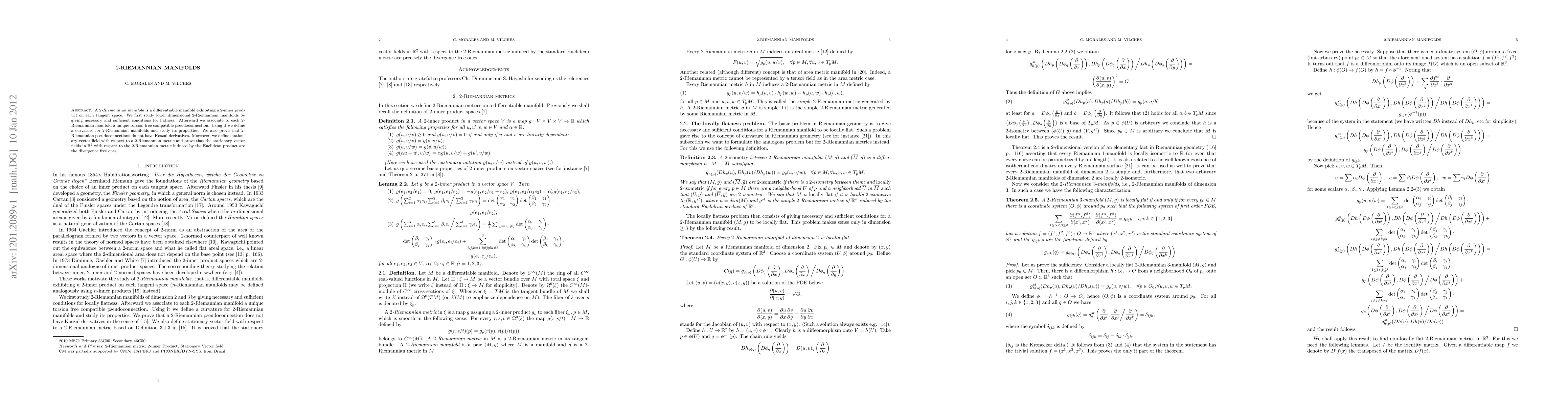 This paper explores 2-Riemannian manifolds, introducing a 2-inner product on each tangent space, and studies their flatness conditions. It defines a torsion-free pseudoconnection, curvature, and stationary vector fields, proving that these pseudoconnections lack Koszul derivatives and identifying divergence-free vector fields in $\mathbb{R}^2$.