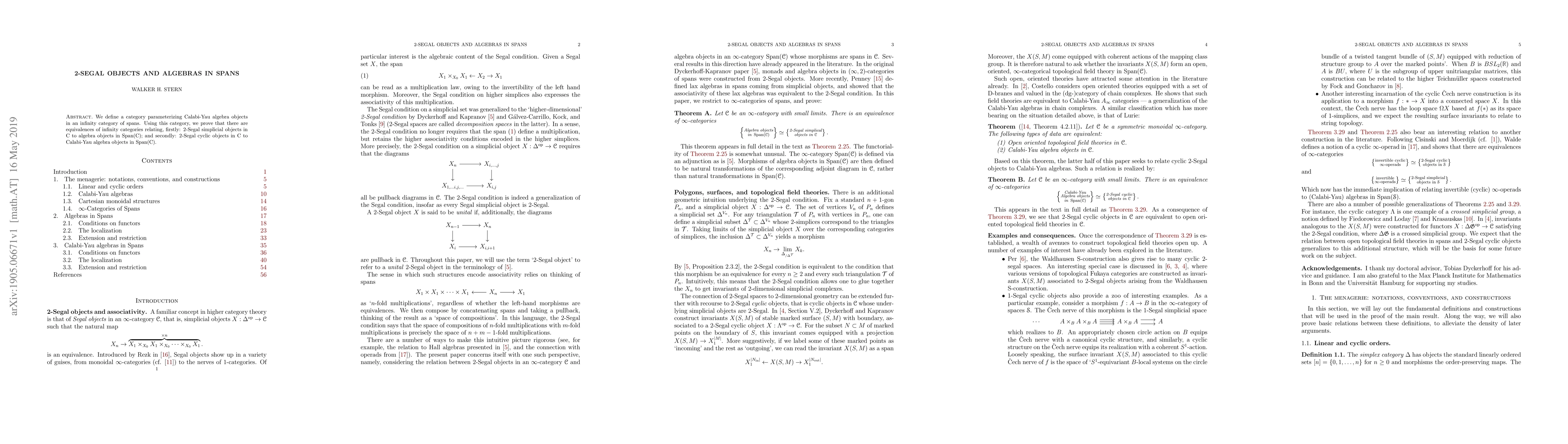 We define a category parameterizing Calabi-Yau algebra objects in an infinity category of spans. Using this category, we prove that there are equivalences of infinity categories relating, firstly: 2-Segal simplicial objects in C to algebra objects in Span(C); and secondly: 2-Segal cyclic objects in C to Calabi-Yau algebra objects in Span(C).