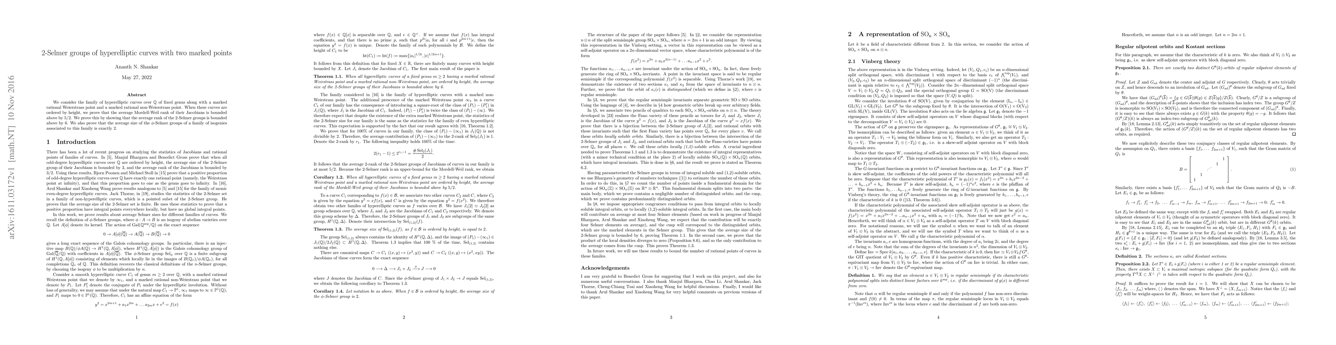 Summary: This paper examines hyperelliptic curves over $\Q$ with specified rational points, proving that the average Mordell-Weil rank of their Jacobians is at most 5/2 by demonstrating the average 2-Selmer group rank is at most 6, and that the average size of associated $\phi$-Selmer groups for related isogenies is exactly 2.