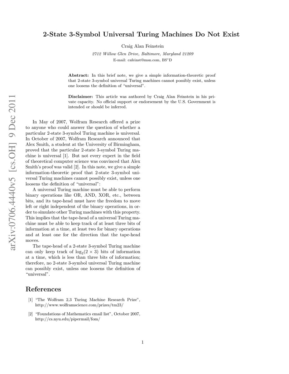 Summary: This paper presents an information-theoretic proof demonstrating that 2-state Turing machines with only 3 symbols cannot be universal, unless the definition of "universal" is relaxed. The result highlights fundamental limits on the computational power of minimal Turing machines.