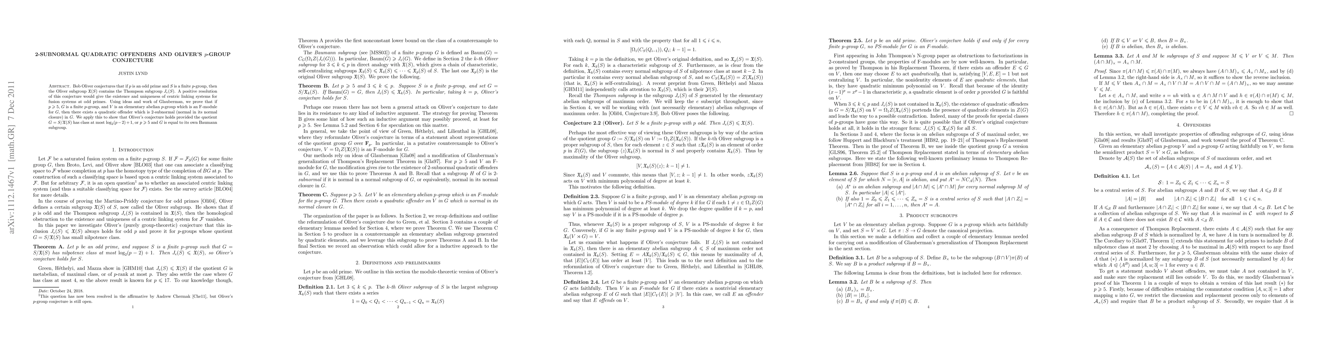 Bob Oliver conjectures that if $p$ is an odd prime and $S$ is a finite $p$-group, then the Oliver subgroup $\X(S)$ contains the Thompson subgroup $J_e(S)$. A positive resolution of this conjecture would give the existence and uniqueness of centric linking systems for fusion systems at odd primes. Using ideas and work of Glauberman, we prove that if $p \geq 5$, $G$ is a finite $p$-group, and $V$ is an elementary abelian $p$-group which is an F-module for $G$, then there exists a quadratic offender which is 2-subnormal (normal in its normal closure) in $G$. We apply this to show that Oliver's conjecture holds provided the quotient $G = S/\X(S)$ has class at most $\log_2(p-2) + 1$, or $p \geq 5$ and $G$ is equal to its own Baumann subgroup.