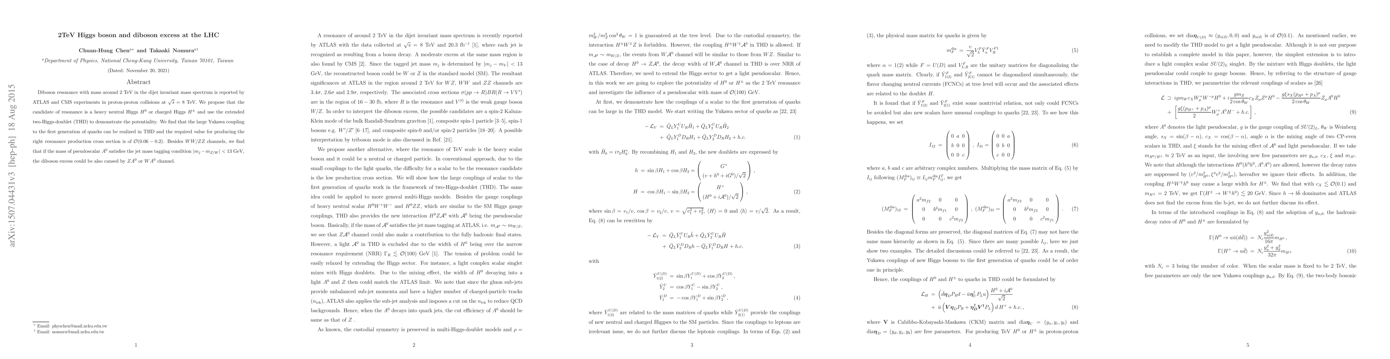 Diboson resonance with mass around 2 TeV in the dijet invariant mass spectrum is reported by ATLAS experiment in proton-proton collisions at $\sqrt{s}=8$ TeV. We propose that the candidate of resonance is a heavy neutral Higgs $H^0$ or charged Higgs $H^\pm$ and use the extended two-Higgs-doublet (THD) to demonstrate the potentiality. We find that the large Yukawa coupling to the first generation of quarks can be realized in THD and the required value for producing the right resonance production cross section is of ${\cal O}(0.06-0.2)$. Besides $WW/ZZ$ channels, we find that if the mass of pseudoscalar $A^0$ satisfies the jet mass tagging condition $|m_j - m_{Z/W}|< 13$ GeV, the diboson excess could be also caused by $ZA^0$ or $WA^0$ channel.