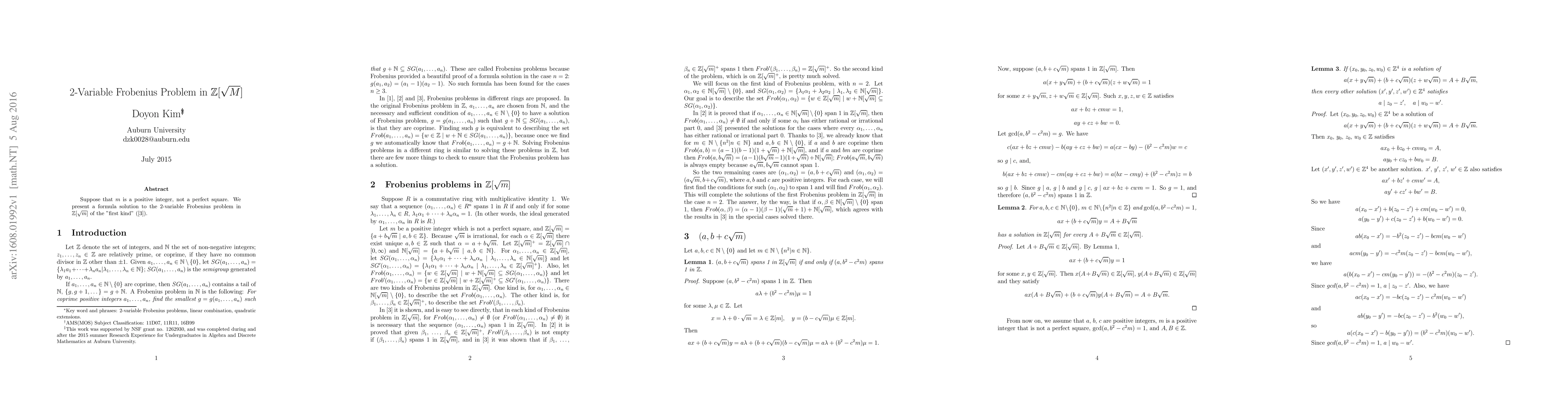 Suppose that m is a positive integer, not a perfect square. We present a formula solution to the 2-variable Frobenius problem in Z[\sqrt m] of the "first kind" ([3]).