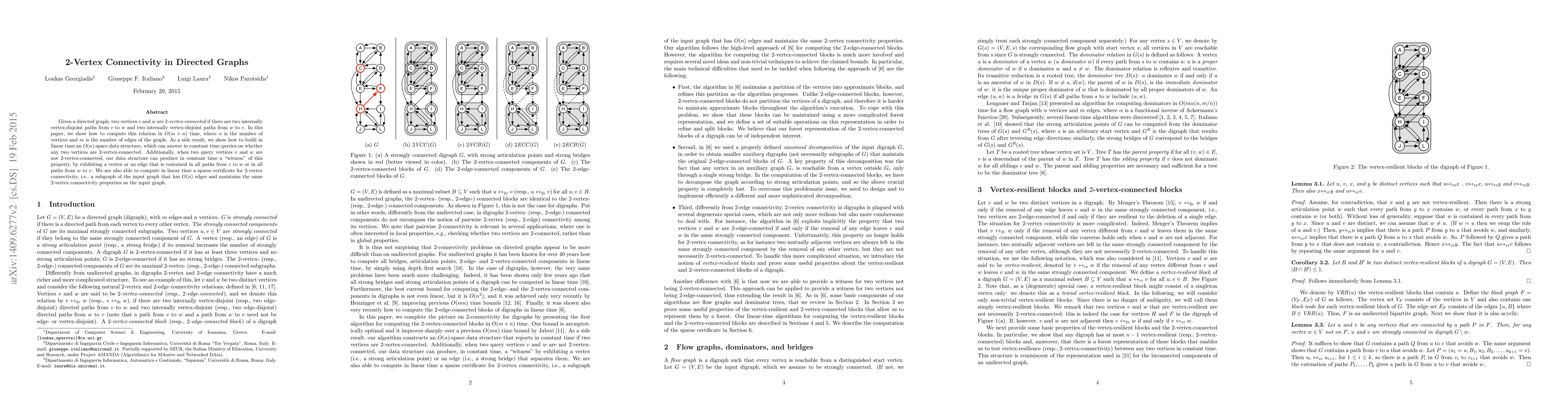 The paper presents algorithms for computing 2-vertex connectivity in directed graphs, introducing concepts like 2-vertex-connected vertices and vertex-resilient vertices, and providing linear-time solutions with sparse certificates.