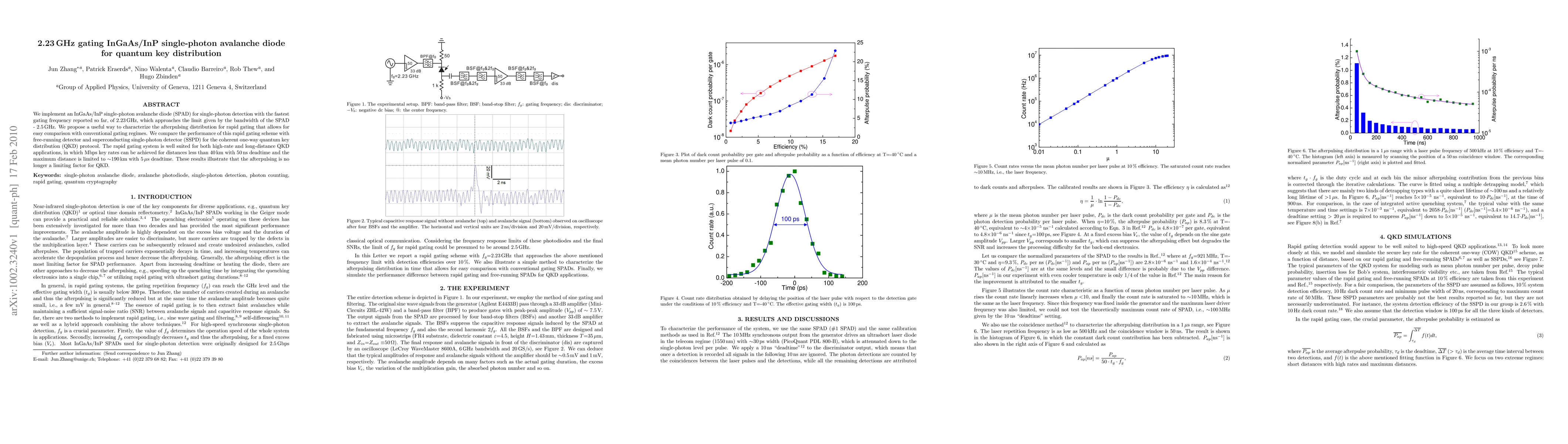 We implement an InGaAs/InP single-photon avalanche diode (SPAD) for single-photon detection with the fastest gating frequency reported so far, of 2.23 GHz, which approaches the limit given by the bandwidth of the SPAD - 2.5 GHz. We propose a useful way to characterize the afterpulsing distribution for rapid gating that allows for easy comparison with conventional gating regimes. We compare the performance of this rapid gating scheme with free-running detector and superconducting single-photon detector (SSPD) for the coherent one-way quantum key distribution (QKD) protocol. The rapid gating system is well suited for both high-rate and long-distance QKD applications, in which Mbps key rates can be achieved for distances less than 40 km with 50 ns deadtime and the maximum distance is limited to ~190km with 5 $\mu$s deadtime. These results illustrate that the afterpulsing is no longer a limiting factor for QKD.