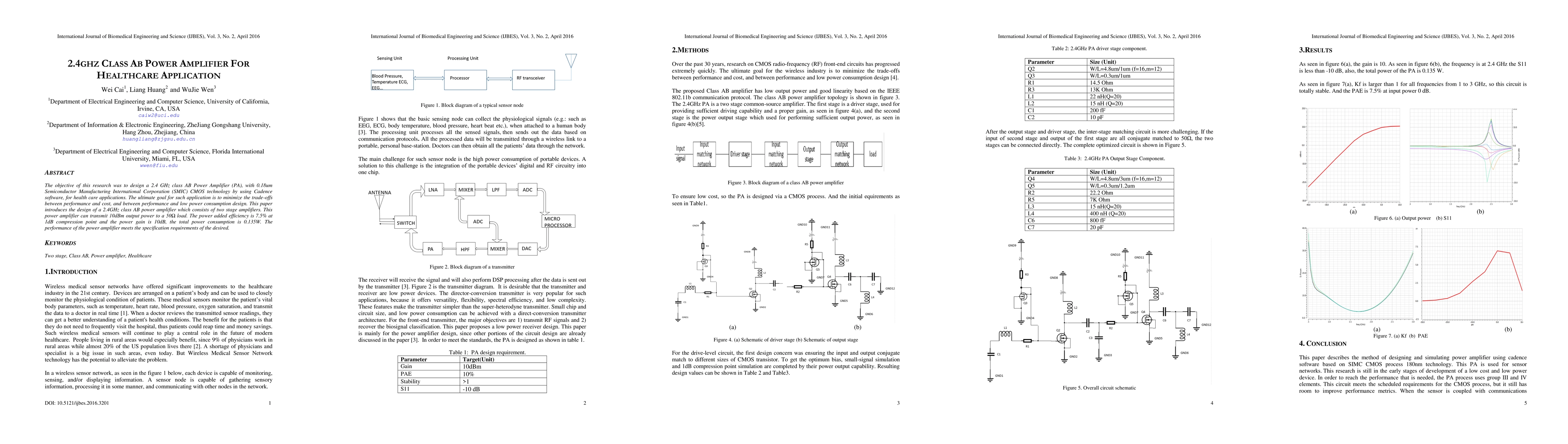 The objective of this research was to design a 2.4 GHz class AB Power Amplifier, with 0.18 um SMIC CMOS technology by using Cadence software, for health care applications. The ultimate goal for such application is to minimize the trade-offs between performance and cost, and between performance and low power consumption design. The performance of the power amplifier meets the specification requirements of the desired.