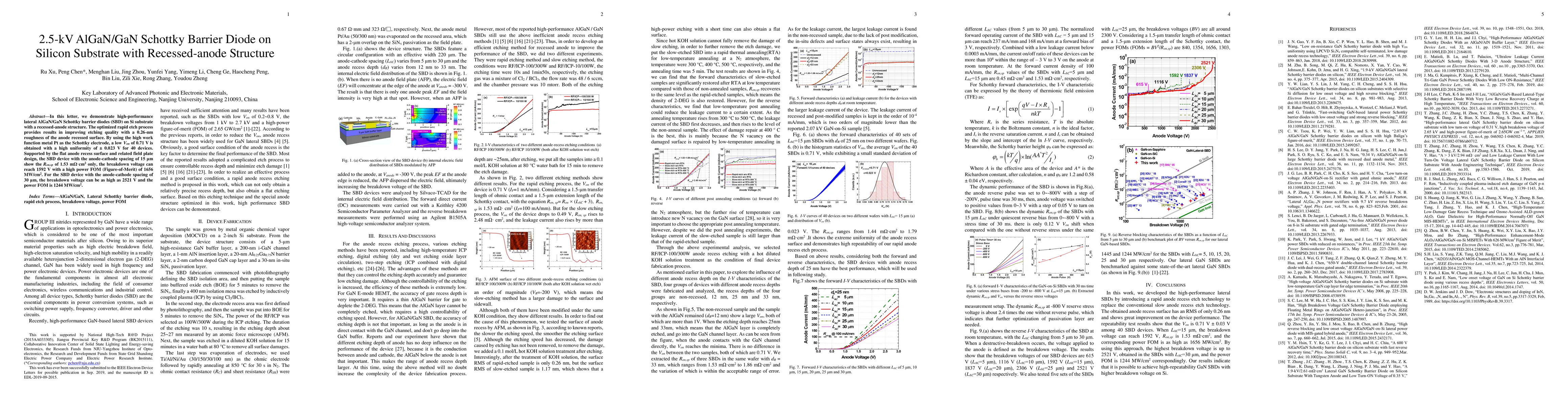 In this letter, we demonstrate high-performance lateral AlGaN/GaN Schottky barrier diodes (SBD) on Si substrate with a recessed-anode structure. The optimized rapid etch process provides results in improving etching quality with a 0.26-nm roughness of the anode recessed surface. By using the high work function metal Pt as the Schottky electrode, a low Von of 0.71 V is obtained with a high uniformity of 0.023 V for 40 devices. Supported by the flat anode recess surface and related field plate design, the SBD device with the anode-cathode spacing of 15 um show the Ron,sp of 1.53 mOhm.cm2 only, the breakdown voltage can reach 1592 V with a high power FOM (Figure-of-Merit) of 1656 MW/cm2. For the SBD device with the anode-cathode spacing of 30 um, the breakdown voltage can be as high as 2521 V and the power FOM is 1244 MW/cm2.