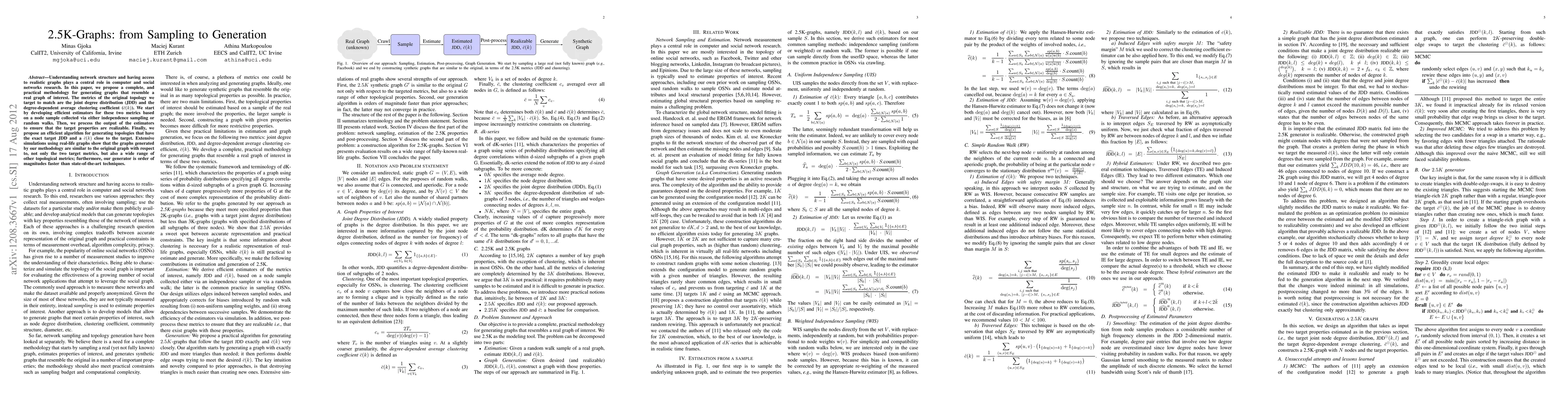 Understanding network structure and having access to realistic graphs plays a central role in computer and social networks research. In this paper, we propose a complete, and practical methodology for generating graphs that resemble a real graph of interest. The metrics of the original topology we target to match are the joint degree distribution (JDD) and the degree-dependent average clustering coefficient ($\bar{c}(k)$). We start by developing efficient estimators for these two metrics based on a node sample collected via either independence sampling or random walks. Then, we process the output of the estimators to ensure that the target properties are realizable. Finally, we propose an efficient algorithm for generating topologies that have the exact target JDD and a $\bar{c}(k)$ close to the target. Extensive simulations using real-life graphs show that the graphs generated by our methodology are similar to the original graph with respect to, not only the two target metrics, but also a wide range of other topological metrics; furthermore, our generator is order of magnitudes faster than state-of-the-art techniques.