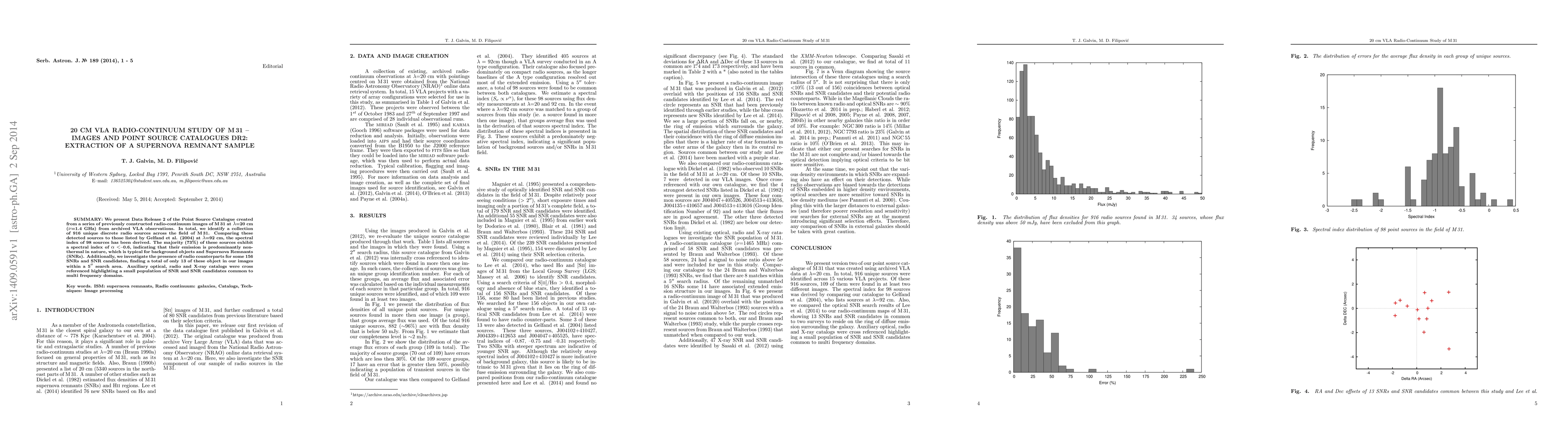 We present Data Release 2 of the Point Source Catalogue created from a series of previously constructed radio-continuum images of M31 at lambda=20 cm (nu=1.4 GHz) from archived VLA observations. In total, we identify a collection of 916 unique discrete radio sources across the field of M31. Comparing these detected sources to those listed by Gelfand et al. (2004) at lambda=92 cm, the spectral index of 98 sources has been derived. The majority (73%) of these sources exhibit a spectral index of alpha <-0.6, indicating that their emission is predominantly non-thermal in nature, which is typical for background objects and Supernova Remnants (SNRs). Additionally, we investigate the presence of radio counterparts for some 156 SNRs and SNR candidates, finding a total of only 13 of these object in our images within a 5 arcsec search area. Auxiliary optical, radio and X-ray catalogs were cross referenced highlighting a small population of SNR and SNR candidates common to multi-frequency domains.