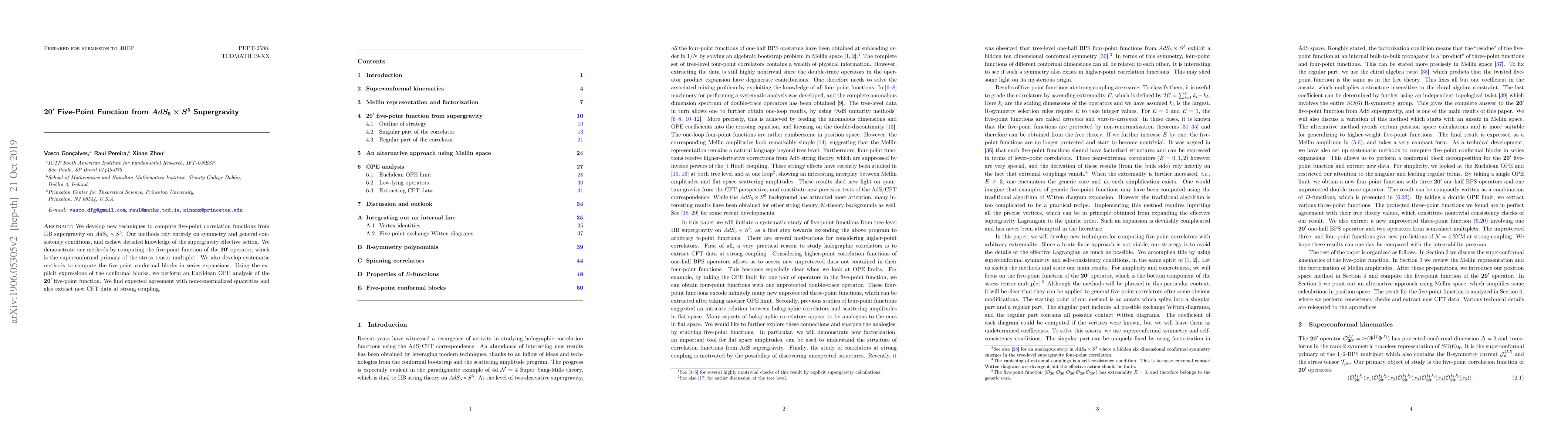 We develop new techniques to compute five-point correlation functions from IIB supergravity on $AdS_5\times S^5$. Our methods rely entirely on symmetry and general consistency conditions, and eschew detailed knowledge of the supergravity effective action. We demonstrate our methods by computing the five-point function of the $\mathbf{20'}$ operator, which is the superconformal primary of the stress tensor multiplet. We also develop systematic methods to compute the five-point conformal blocks in series expansions. Using the explicit expressions of the conformal blocks, we perform a Euclidean OPE analysis of the $\mathbf{20'}$ five-point function. We find expected agreement with non-renormalized quantities and also extract new CFT data at strong coupling.