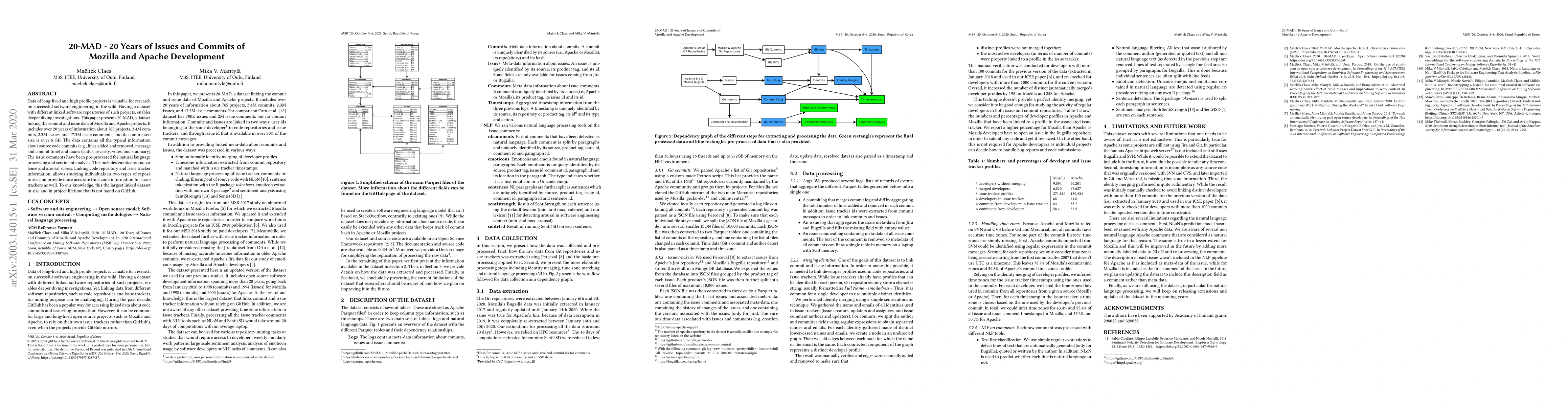 Data of long-lived and high profile projects is valuable for research on successful software engineering in the wild. Having a dataset with different linked software repositories of such projects, enables deeper diving investigations. This paper presents 20-MAD, a dataset linking the commit and issue data of Mozilla and Apache projects. It includes over 20 years of information about 765 projects, 3.4M commits, 2.3M issues, and 17.3M issue comments, and its compressed size is over 6 GB. The data contains all the typical information about source code commits (e.g., lines added and removed, message and commit time) and issues (status, severity, votes, and summary). The issue comments have been pre-processed for natural language processing and sentiment analysis. This includes emoticons and valence and arousal scores. Linking code repository and issue tracker information, allows studying individuals in two types of repositories and provide more accurate time zone information for issue trackers as well. To our knowledge, this the largest linked dataset in size and in project lifetime that is not based on GitHub.